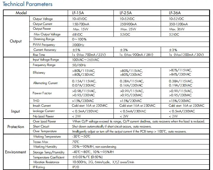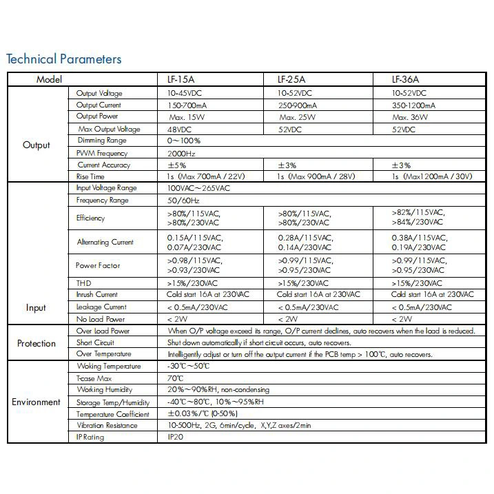 Tuân thủ điện áp tự động: Trình điều khiển tự động điều chỉnh điện áp đầu ra để phù hợp với yêu cầu điện áp chuyển tiếp của tải LED được kết nối, trong phạm vi chỉ định (ví dụ: 12-24VDC, 20-40VDC).
