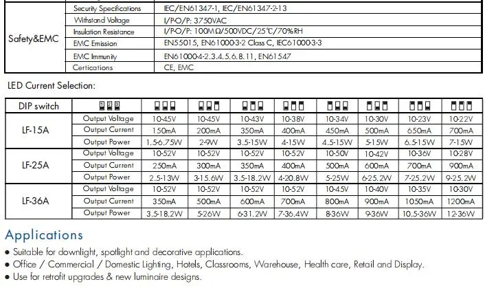 Hoạt động ổn định của đèn LED: Cung cấp dòng điện đầu ra cố định, được điều chỉnh (ví dụ: 700mA, 1050mA) trên phạm vi điện áp đầu ra rộng. Điều này rất cần thiết để điều khiển trực tiếp các dãy đèn LED, đảm bảo độ sáng ổn định và ngăn ngừa hiện tượng thoát nhiệt.