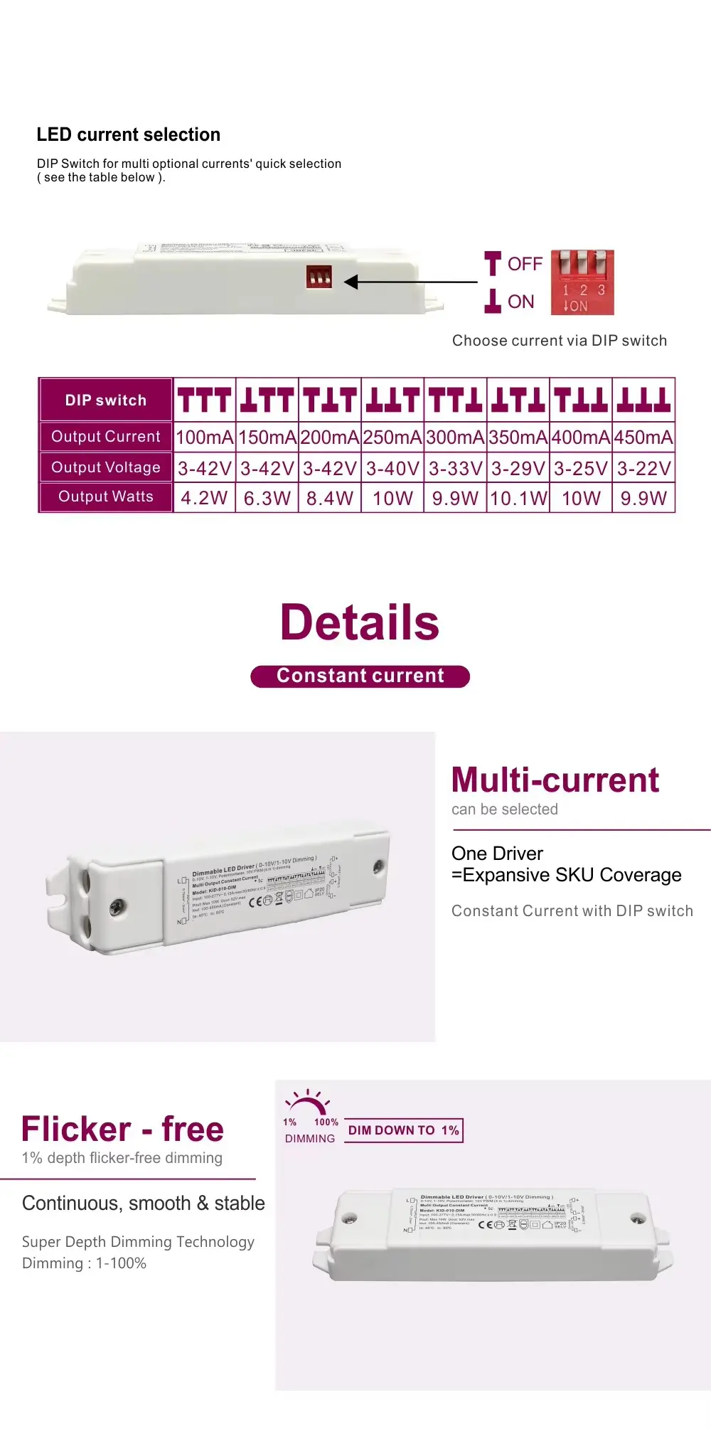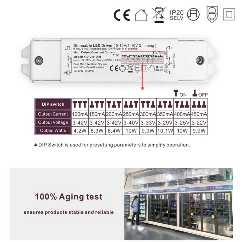 Được thiết kế để mang lại hiệu suất ổn định, bộ điều chỉnh độ sáng này hỗ trợ đầu ra DC rộng 3-42V, giúp nó tương thích với nhiều mô-đun và dải đèn LED điện áp thấp phổ biến. Khả năng chấp nhận điện áp đầu vào trong phạm vi rộng của nó đảm bảo hoạt động ổn định trong nhiều môi trường điện khác nhau. Có khả năng điều khiển tải từ 10W đến 60W, nó hoàn toàn phù hợp cho nhiều ứng dụng trong nhà—từ chiếu sáng tạo điểm nhấn, chiếu sáng vịnh nhỏ và chiếu sáng nhiệm vụ dưới tủ trong nhà cho đến chiếu sáng xung quanh đòi hỏi khắt khe hơn trong khách sạn, nhà hàng và văn phòng.