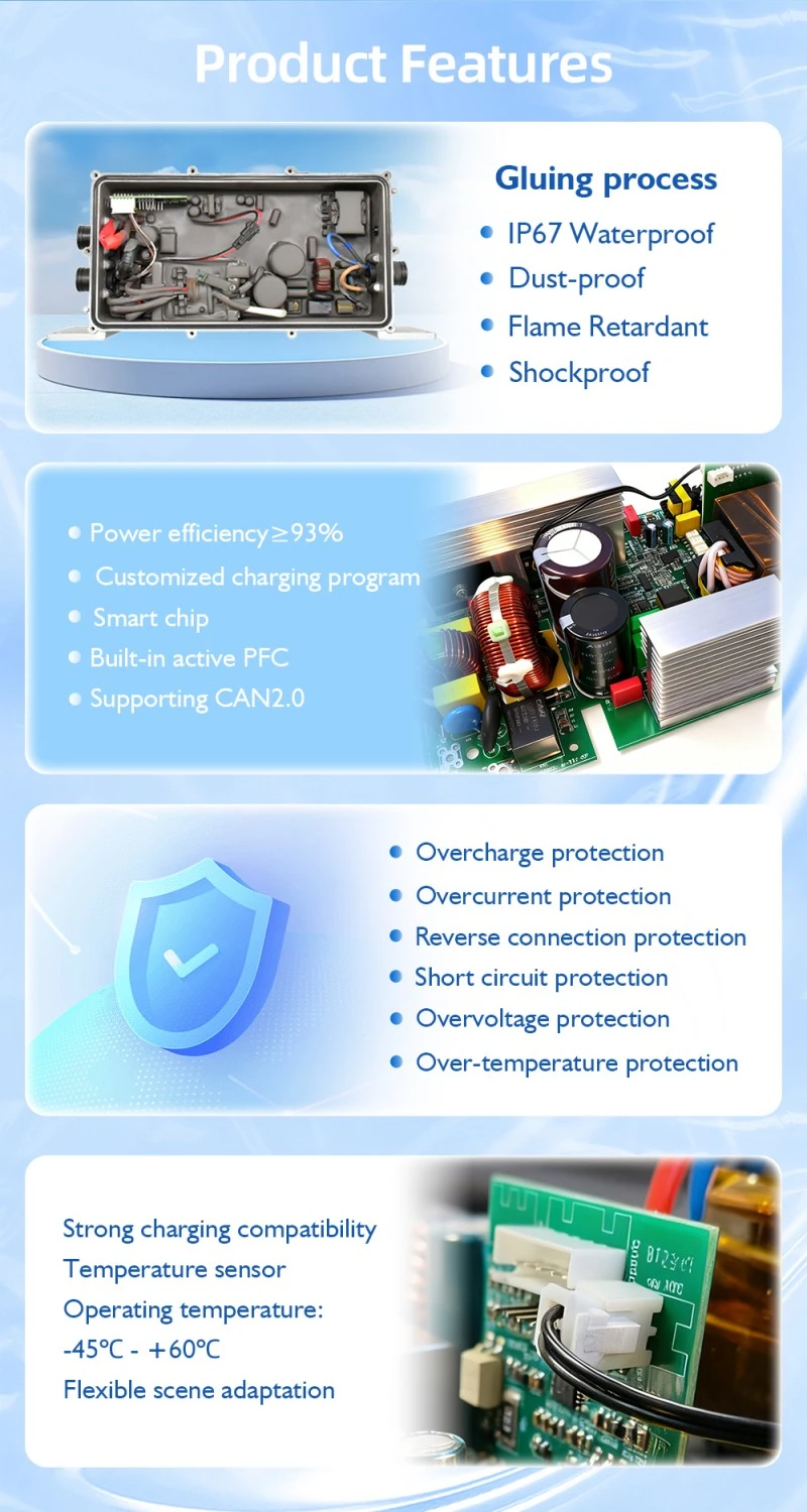 Với dải điện áp đầu vào rộng 90-260V AC, Bộ sạc pin Bộ sạc tích hợp OBC 1,2kW sản xuất tại Trung Quốc này tương thích với lưới điện ở tất cả các khu vực trên thế giới, loại bỏ nhu cầu sử dụng thêm bộ chuyển đổi điện áp để sử dụng quốc tế. Nó duy trì đầu ra 48V/25A ổn định ngay cả khi điện áp đầu vào dao động (±10%), đảm bảo hiệu suất sạc ổn định cho bộ pin 48V trong xe điện, xe nâng và thiết bị hàng hải.