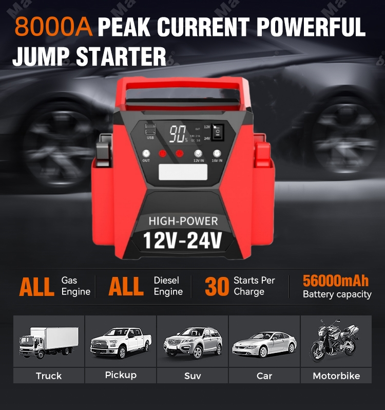 STARWELL giới thiệu Bộ sạc pin thông minh khởi động ô tô 12V/24V hiệu suất cao, một công cụ thay đổi cuộc chơi dành cho những chủ phương tiện đang tìm kiếm độ tin cậy và thông minh trong việc bảo trì pin và khởi động khẩn cấp. Được trang bị dòng điện cực đại 8000A và dòng khởi động 4000A, bộ sạc pin thông minh điện áp kép này kết hợp nguồn điện mạnh mẽ với công nghệ thông minh, giúp nó phù hợp với tất cả động cơ xăng và động cơ diesel lên đến 15L, bao gồm ô tô, xe tải, RV, xe máy, thuyền và thậm chí cả xe thương mại hạng nặng.