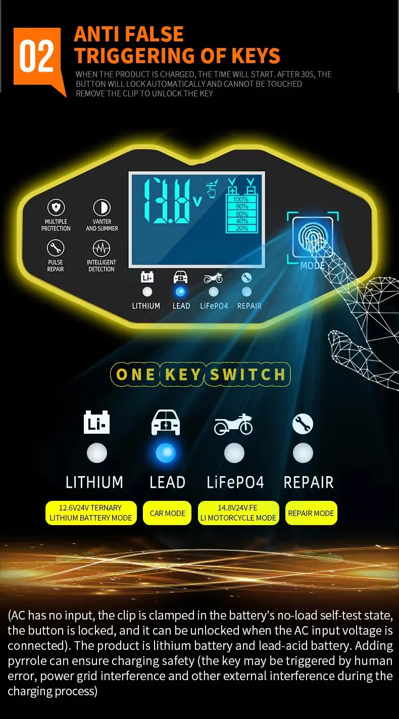 1. Thông minh và tương thích ZYX-J40 hỗ trợ hầu hết mọi loại pin trên thị trường, bao gồm axit chì, AGM, Gel, EFB, Li-ion và LiFePO₄ (lithium sắt photphat). Với dải công suất rộng từ 2Ah đến 150Ah, nó xử lý mọi thứ từ ắc quy xe máy nhỏ đến ắc quy ô tô lớn.