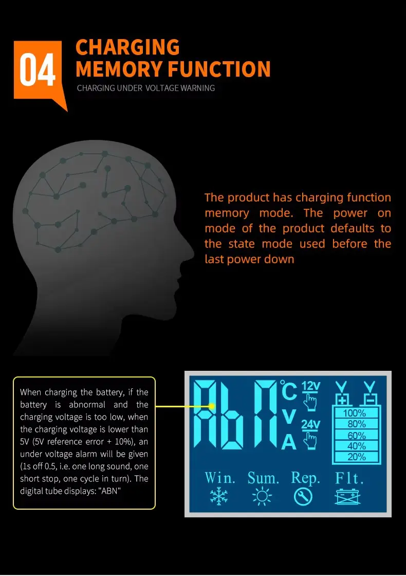 Bộ sạc 7 giai đoạn phù hợp với hầu hết các loại pin bao gồm Canxi, Gel AGM, Wet, Lithium. Axit chì. Pin LifePo4. Chúng cũng có thể giúp khôi phục pin đã cạn kiệt và bị sunfat hóa.