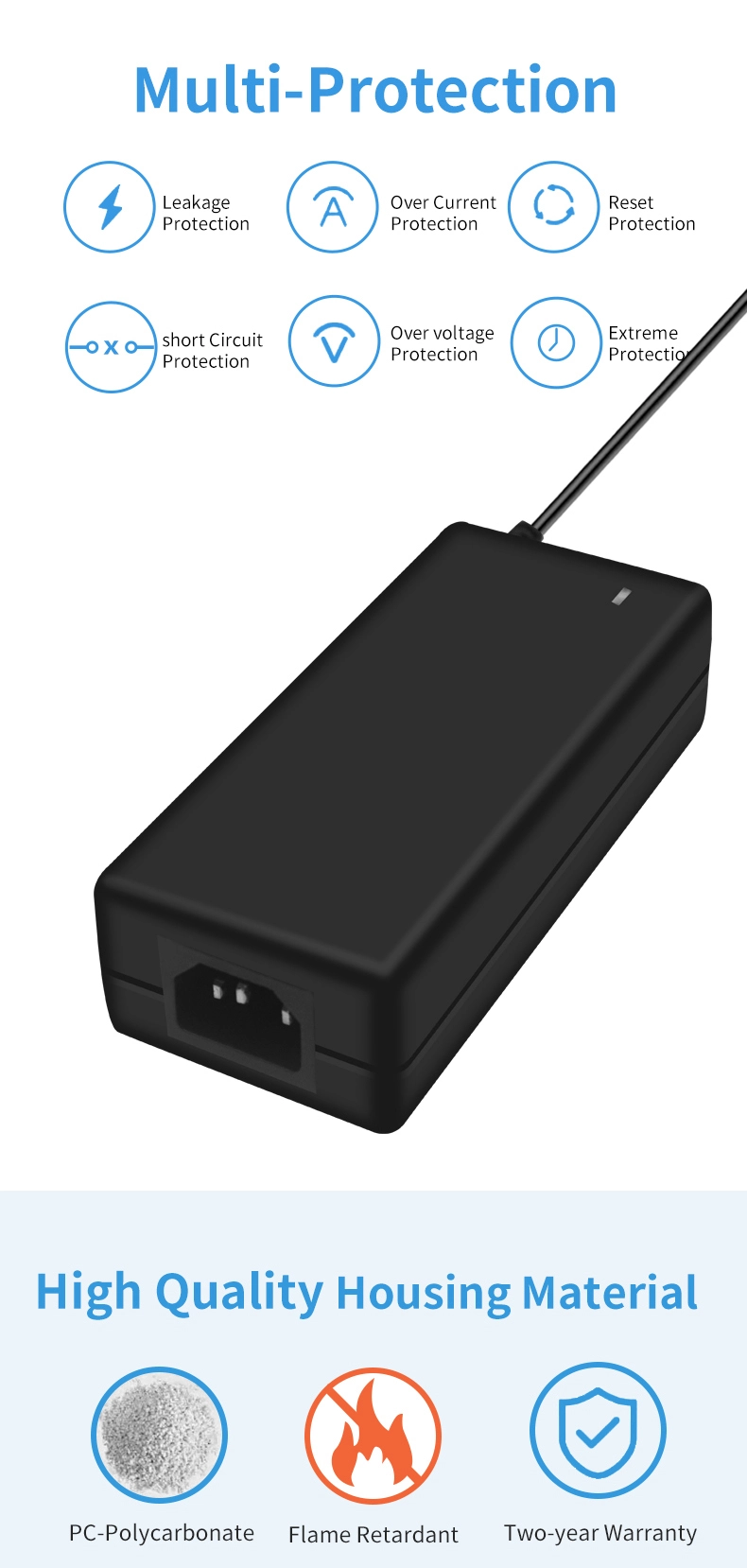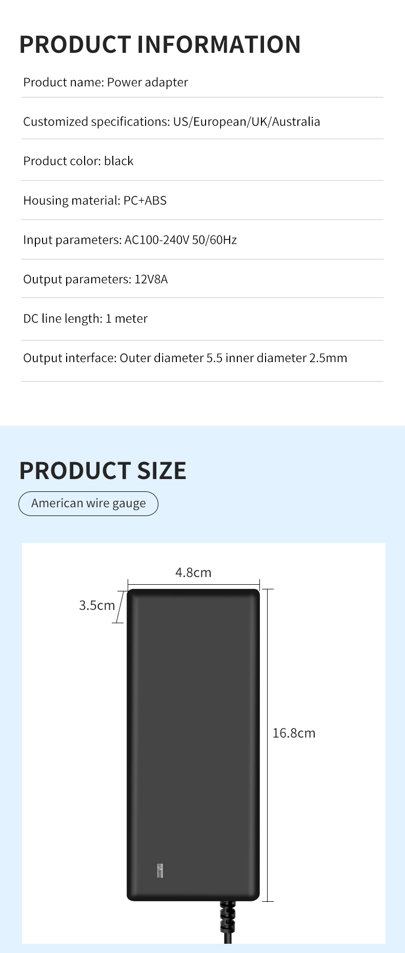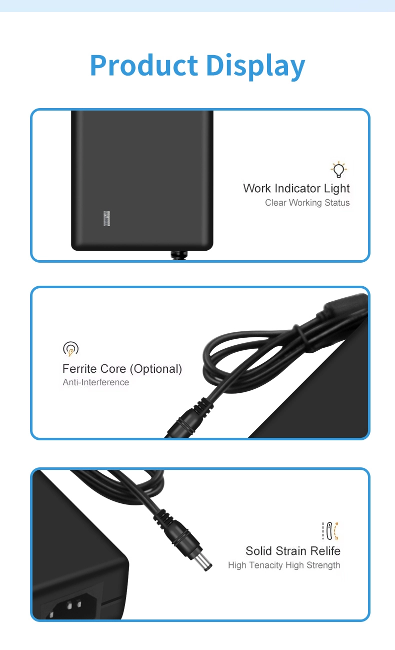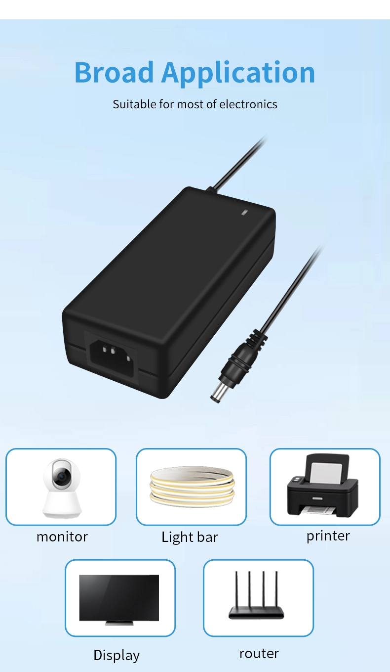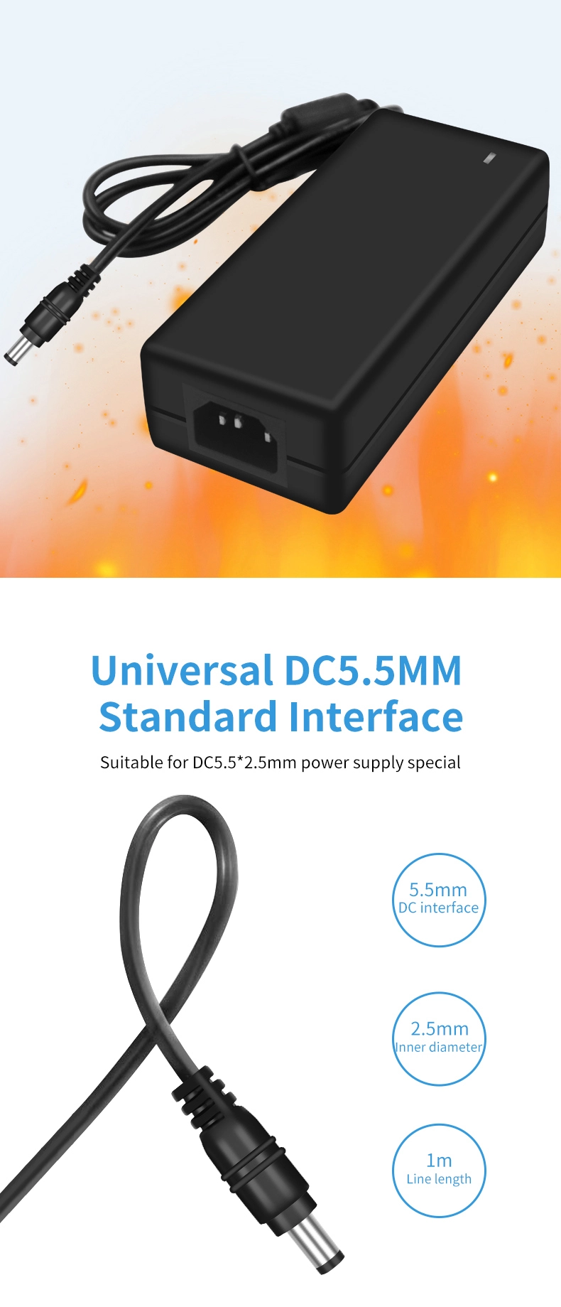 Đầu vào điện áp rộng AC 100-240V tương thích với lưới điện tại hơn 100 quốc gia trên toàn thế giới. Cáp đầu ra mở rộng 1,5m (đường kính 1,0 mm²) được ghép nối với đầu nối DC xoay 180° thích ứng với nhiều tình huống lắp đặt khác nhau. Với kích thước nhỏ gọn chỉ 120×60×30mm, nó nhỏ hơn 35% so với các bộ điều hợp truyền thống có cùng công suất, chỉ nặng 280g—cải thiện tính di động lên 50%.