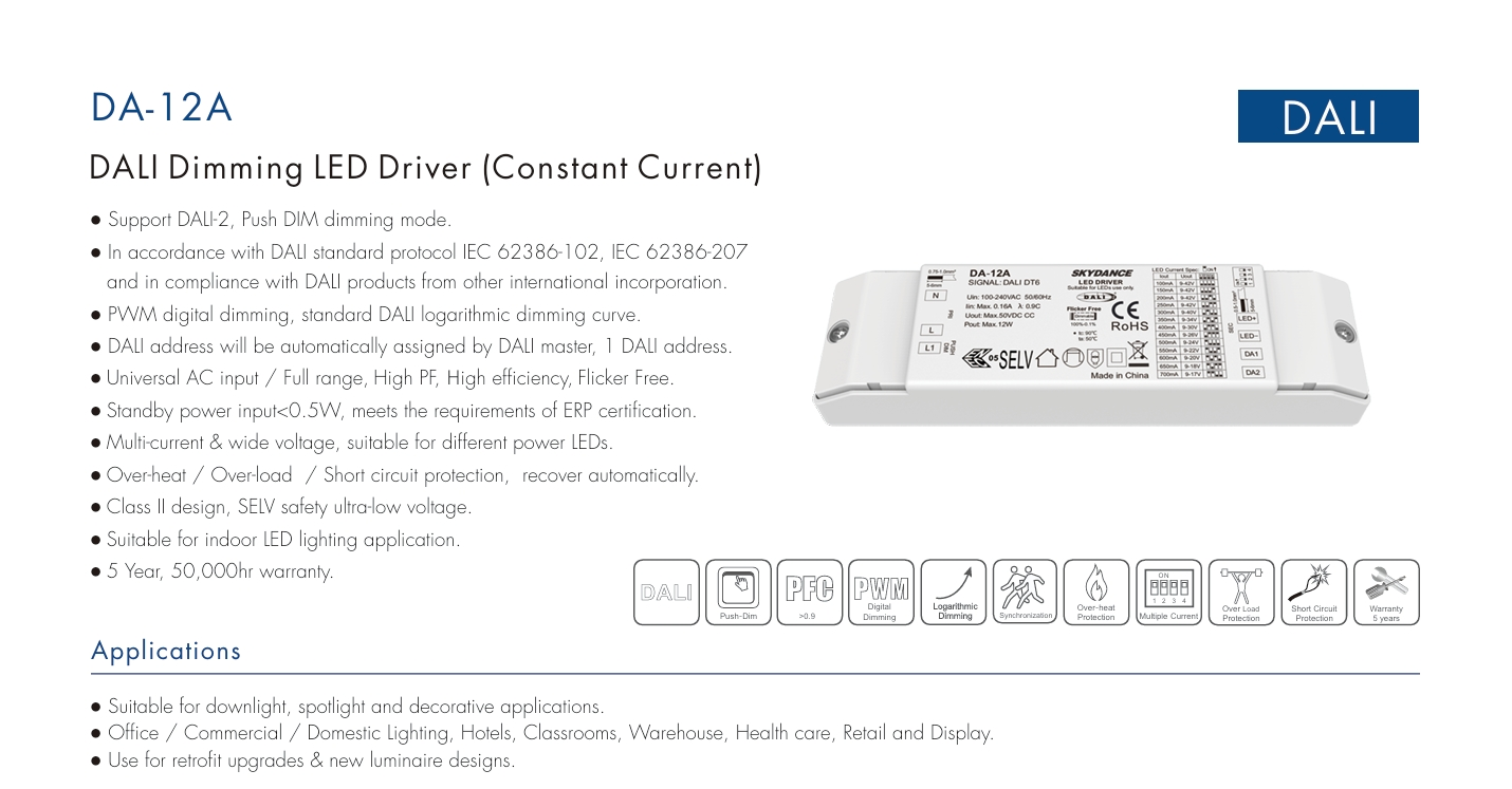 Hiệu suất năng lượng vượt trội: Khi trình điều khiển đèn LED có thể điều chỉnh độ sáng STARWELL DALI hoạt động ở mức đầy tải, PF> 0,95 ở mức đầy tải, hiệu suất tối đa 87% và dòng rò ≤0,24mA, tuân thủ các tiêu chuẩn ErP.