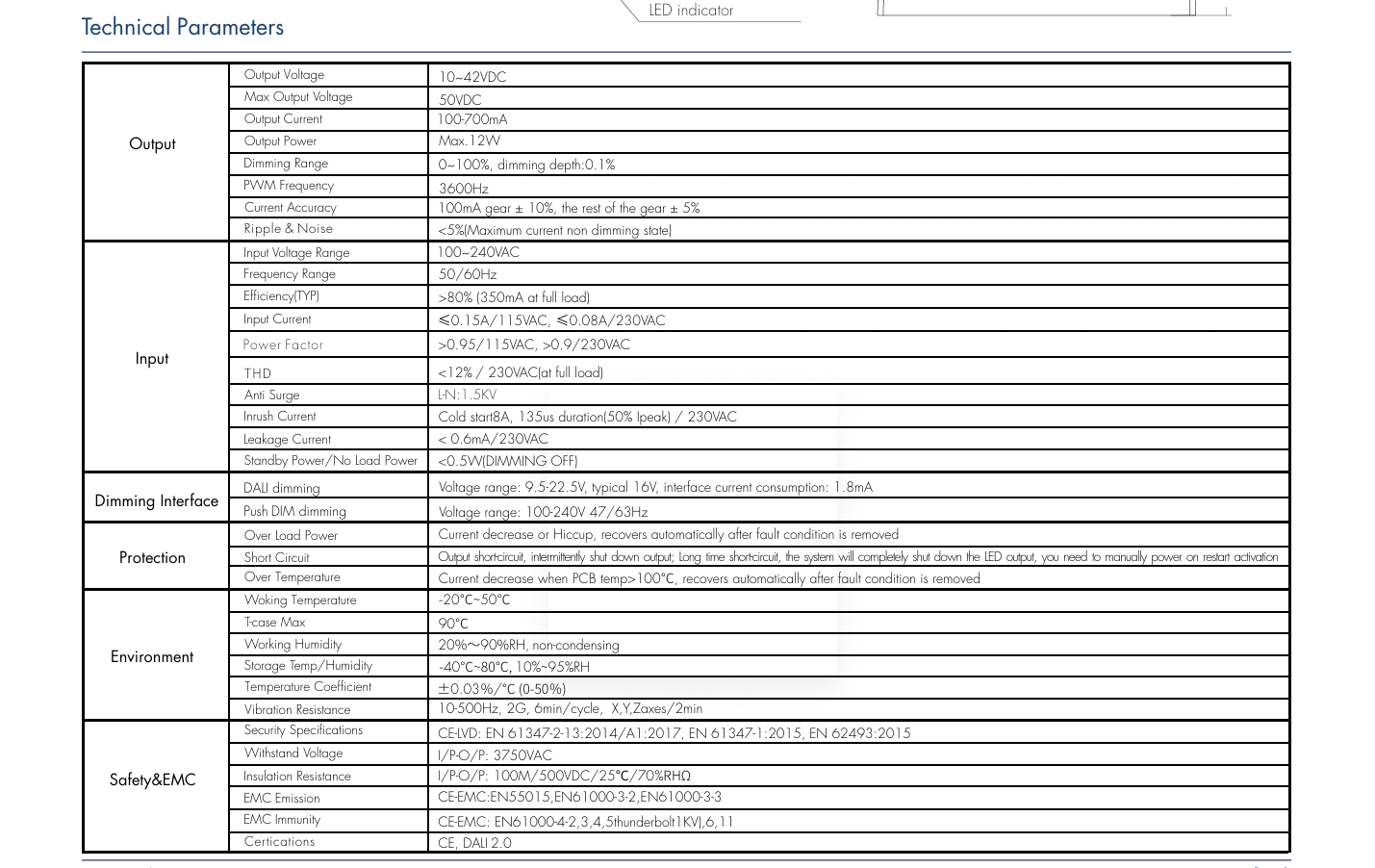 Bảo vệ thông minh & Độ bền: Được trang bị các biện pháp bảo vệ quá điện áp, quá tải, ngắn mạch và quá nhiệt (kích hoạt 110oC); Tuổi thọ 100.000 giờ ở 75oC.