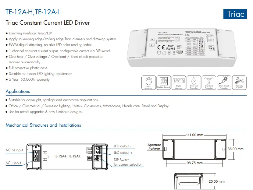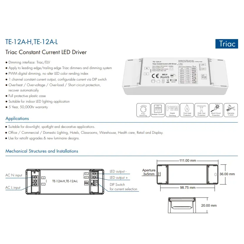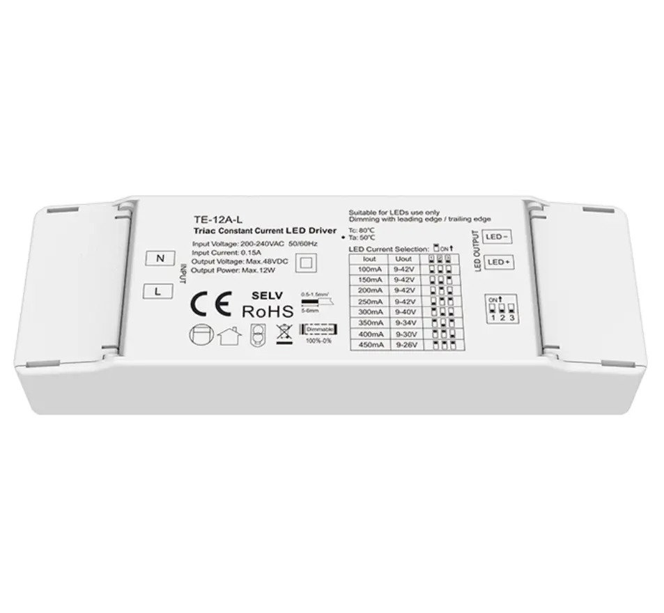 Trình điều khiển đèn LED điều chỉnh độ sáng triac dòng không đổi 12W chất lượng cao của Starwell tích hợp các chức năng bảo vệ quá áp, quá dòng và ngắn mạch, đồng thời có hệ số công suất cao và độ méo sóng hài thấp, đáp ứng nhiều tiêu chuẩn an toàn và tiết kiệm năng lượng quốc tế. Thiết kế nhỏ gọn của nó giúp dễ dàng lắp đặt và phù hợp với nhiều tình huống chiếu sáng trong nhà khác nhau như đèn downlight, đèn định vị và đèn trang trí, khiến nó trở thành giải pháp điều khiển lý tưởng cho các ứng dụng cải tạo tiết kiệm năng lượng và chiếu sáng thông minh. Sản phẩmĐặc trưng: