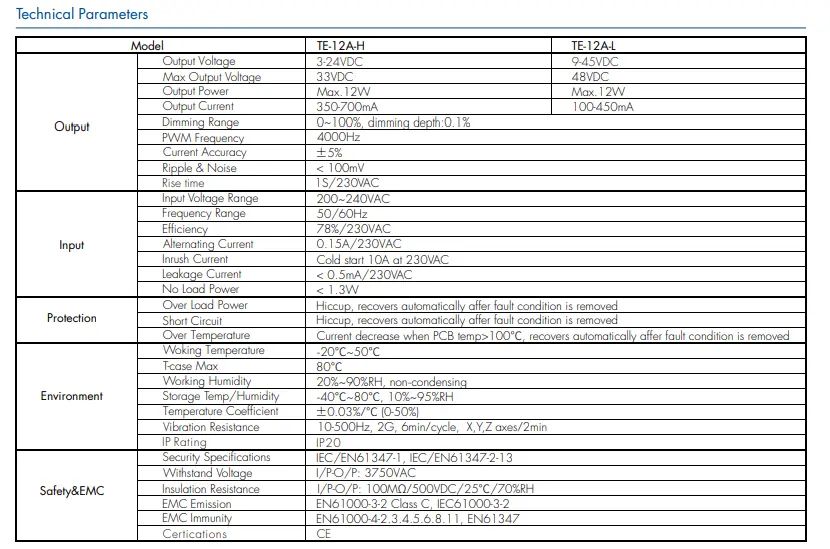 Điện áp đầu vào: 200-240VAC 50-60Hz Dòng điện đầu vào: 0,15A Công suất đầu ra: Tối đa 12 Watts Điện áp đầu ra: 9~42V Bảo hành: 2 năm Giấy chứng nhận: CE/Rohs