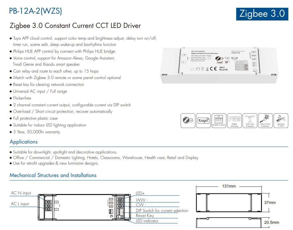 Trình điều khiển đèn LED có thể điều chỉnh độ sáng TUYA Zigbee CCT 12W có hiệu suất chuyển đổi cao lên tới 85%, hệ số công suất ≥0,90 và mức tiêu thụ điện năng không tải thấp, giúp giảm lãng phí năng lượng một cách hiệu quả. Tích hợp đầy đủ các biện pháp bảo vệ bao gồm quá điện áp, quá dòng, ngắn mạch và quá nhiệt đảm bảo hoạt động an toàn và ổn định. Với vỏ bọc nhỏ gọn và chống cháy, nó được sử dụng rộng rãi trong các hệ thống chiếu sáng trắng có thể điều chỉnh trong nhà thông minh, khách sạn, văn phòng và bán lẻ, mang lại hiệu suất điều chỉnh độ sáng thông minh đáng tin cậy và thân thiện với người dùng.