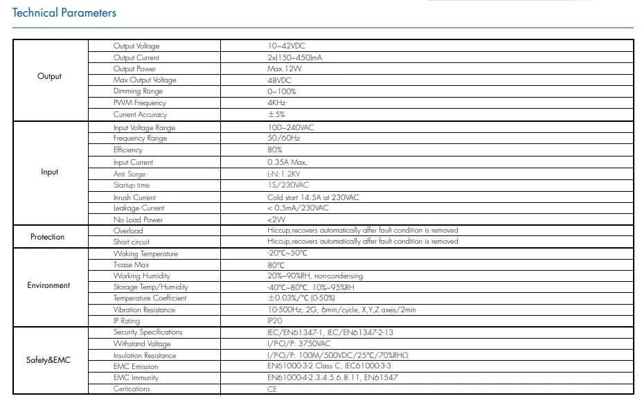 Với đầu vào phổ biến 100~240VAC, Trình điều khiển đèn LED có thể điều chỉnh độ sáng CCT thích ứng với lưới điện toàn cầu. Hiệu suất cao lên tới 85% và hệ số công suất ≥0,90 giảm mức tiêu thụ năng lượng và sinh nhiệt, kéo dài tuổi thọ của cả trình điều khiển và đèn LED.