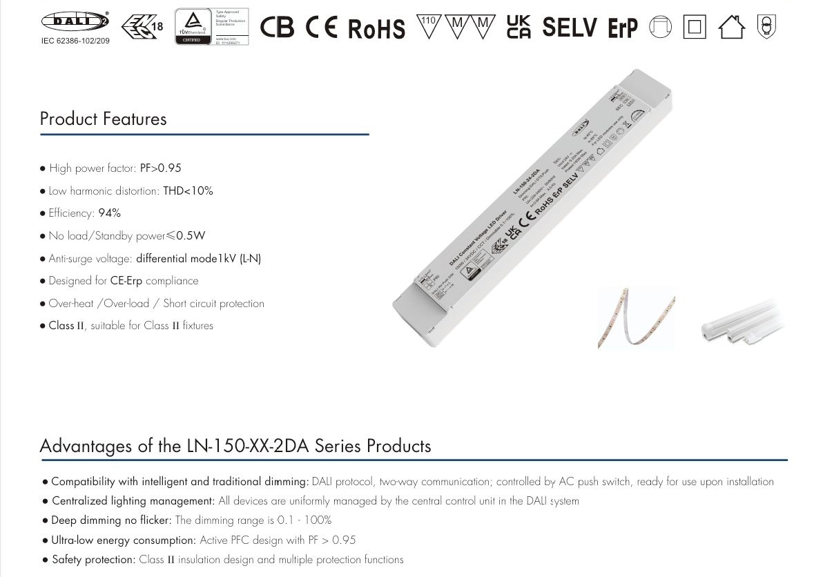 Cách điện kép: Trình điều khiển đèn LED điện áp không đổi DALI CCT 150W 24V bao gồm lớp cách điện cơ bản và lớp cách điện bổ sung, tạo thành hai lớp bảo vệ cách điện độc lập, ngay cả khi một lớp bị hỏng thì lớp kia vẫn có thể ngăn ngừa điện giật