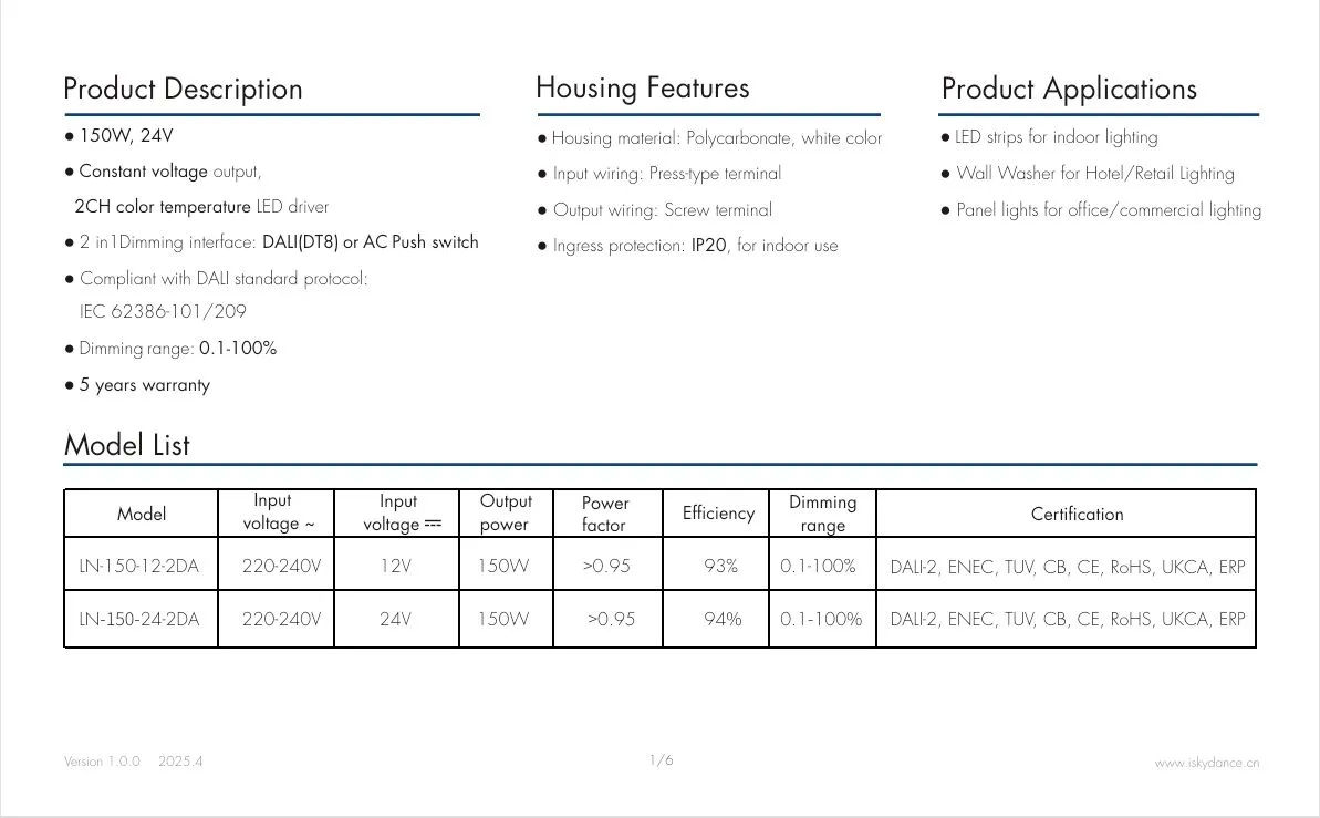 Bộ điều khiển đèn LED điện áp không đổi DALI CCT 150W 24V DALI CCT bán chạy của nhà máy Starwell hỗ trợ điều chỉnh nhiệt độ màu kép DALI CCT độc lập, cho phép kiểm soát chính xác độ sáng và nhiệt độ màu để đáp ứng các nhu cầu chiếu sáng đa dạng. Sản phẩm có hiệu suất cao 91%, hệ số công suất (PF) > 0,95, độ méo sóng hài thấp (THD) < 10% và mức tiêu thụ điện năng ở chế độ chờ cực thấp (≤ 0,5W), đáp ứng tiêu chuẩn tiết kiệm năng lượng CE-Erp.