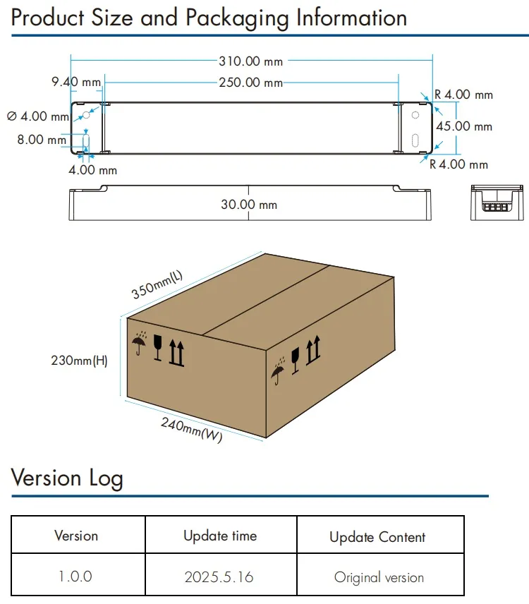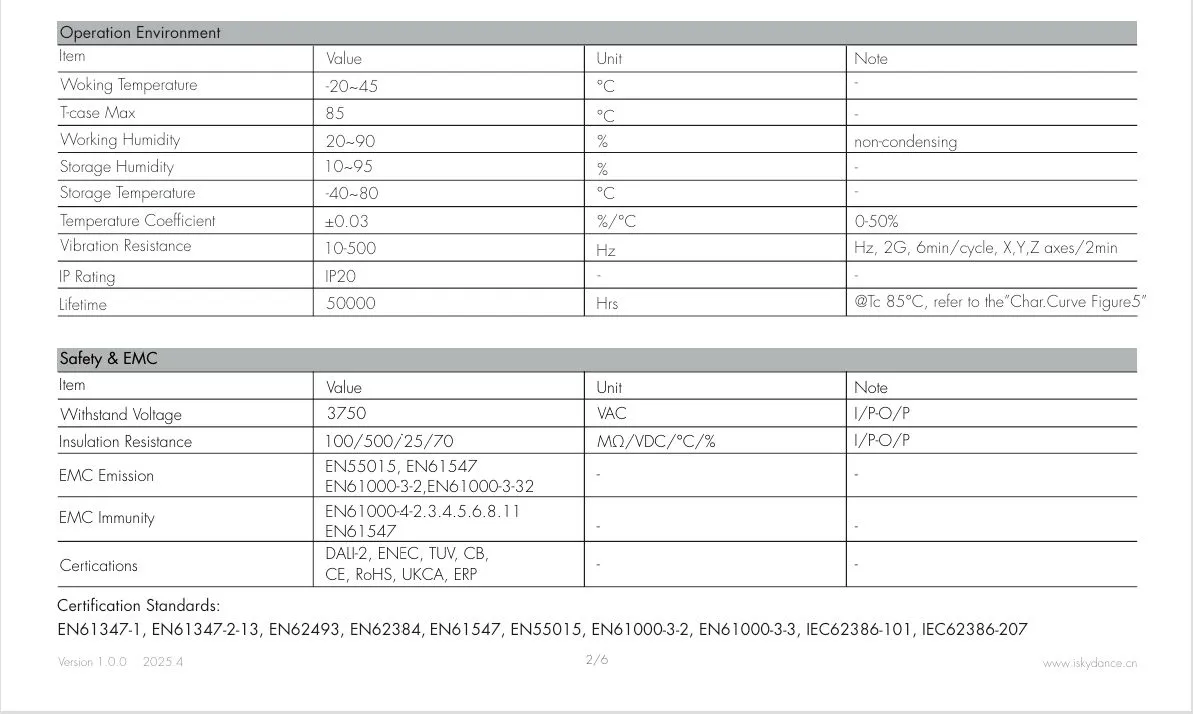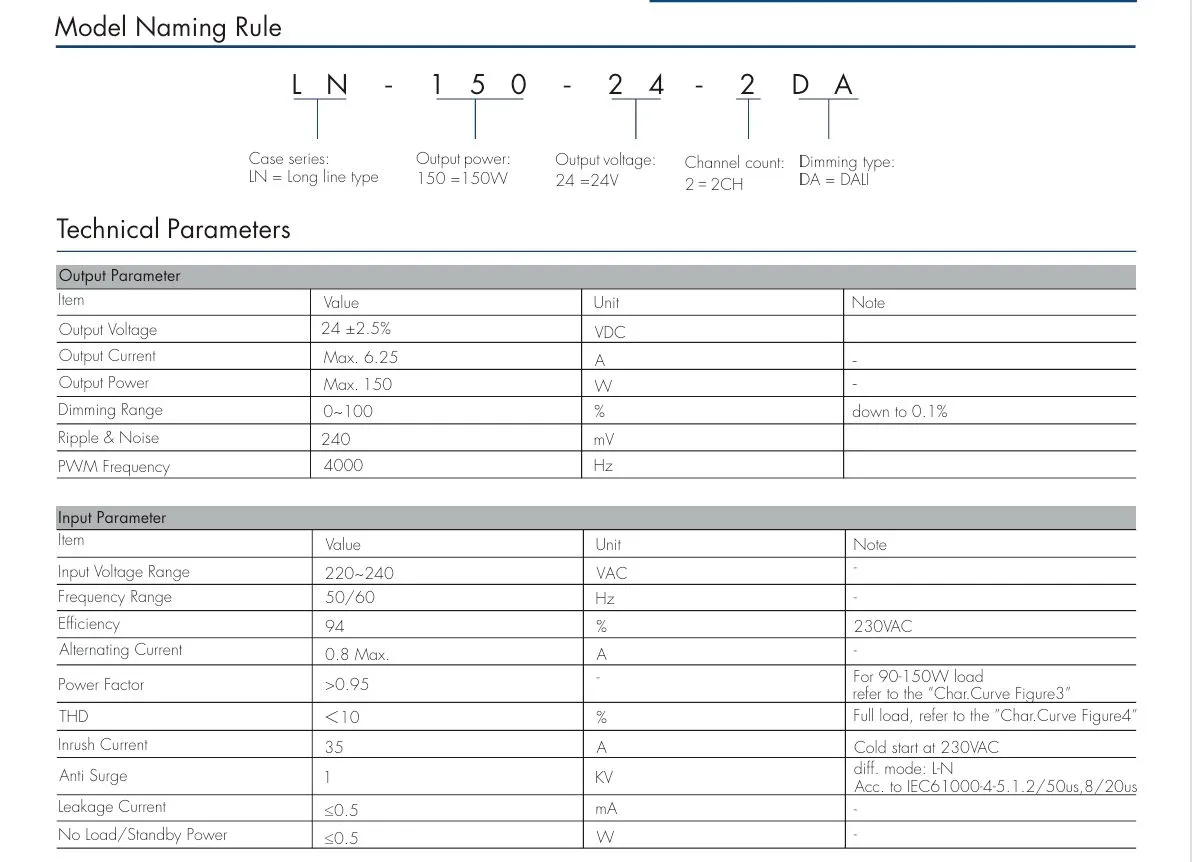 Giao diện mờ Điều chỉnh độ sáng 0/1-10V: Phạm vi điều chỉnh độ sáng 0-10V hoặc 1-10V, mức tiêu thụ dòng điện của đầu nối điều chỉnh độ sáng ≤ 0,3 mA, đường cong điều chỉnh độ sáng tham khảo “Char.curve Hình 6-7”, Đường cong CCT tham khảo “Đường cong Char. Hình 8”. Công tắc điều chỉnh độ sáng bằng nút nhấn: Dải điện áp 220~240VAC 50/60Hz.
