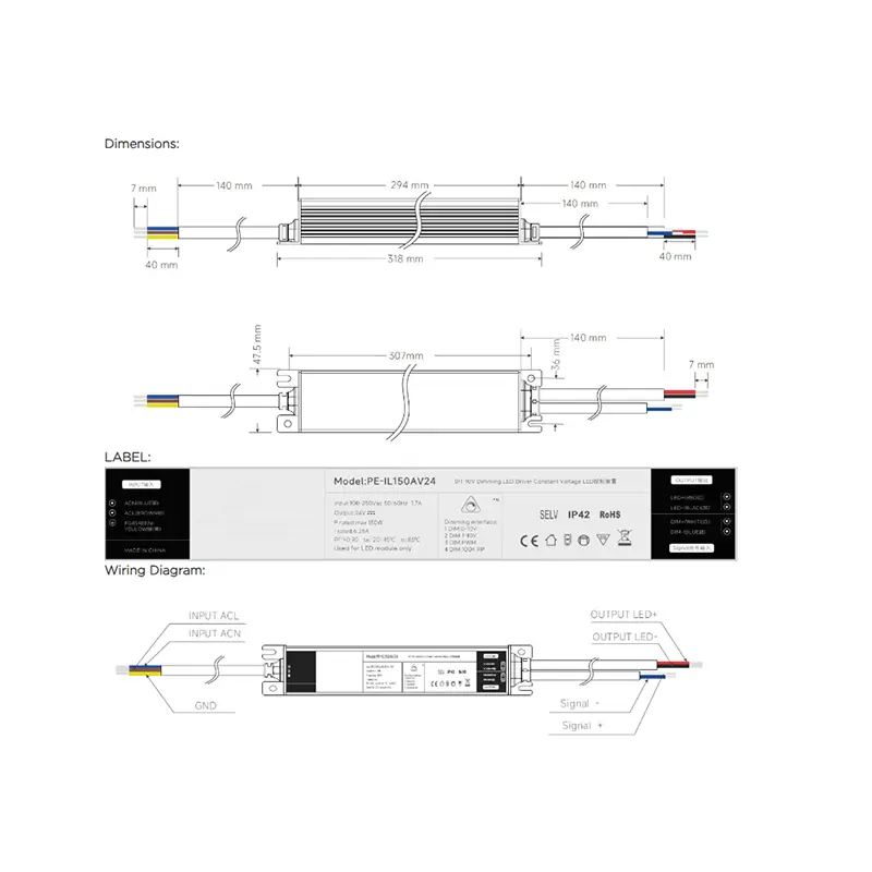 Được trang bị giao diện điều chỉnh độ sáng tiêu chuẩn 0-10V, hỗ trợ điều chỉnh độ sáng mượt mà từ 1% đến 100%, tương thích với hầu hết các bộ điều chỉnh độ sáng hàng đầu trên thị trường. Tự hào với hiệu suất năng lượng cao lên tới 95% và phạm vi đầu vào AC rộng 100-277V, nó dễ dàng thích ứng với các tiêu chuẩn điện áp toàn cầu, hoàn hảo cho các dự án quốc tế.