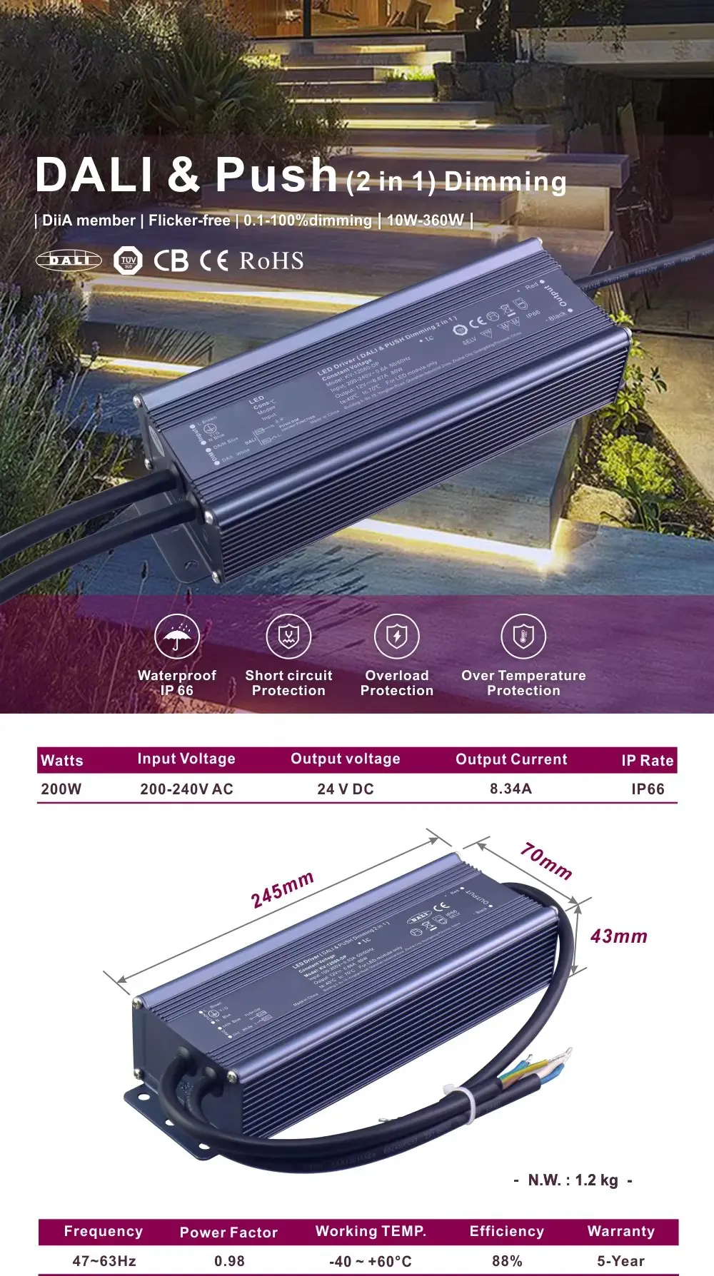 Được thiết kế để mang lại hiệu suất hoàn hảo, nó có khả năng hoạt động không nhấp nháy thực sự và phạm vi điều chỉnh độ sáng cực kỳ mượt mà từ 0,1% đến 100%, cho phép tạo ra bầu không khí và chất lượng ánh sáng hoàn hảo. Có dải công suất rộng từ 10W đến 360W, với đầu ra 12V hoặc 24VDC, đây là giải pháp nguồn lý tưởng, phù hợp với tương lai cho nhiều dải đèn LED và mô-đun có điện áp không đổi.