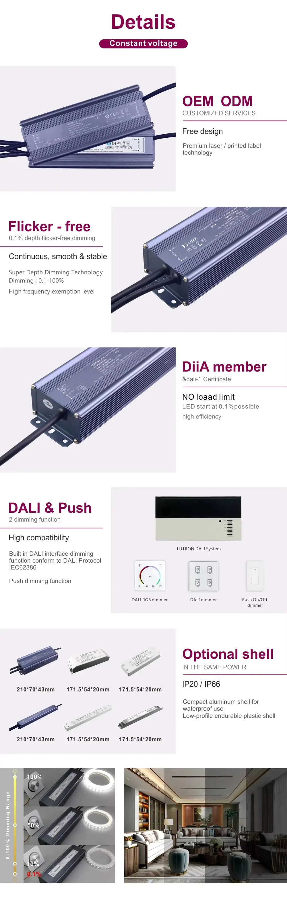 Trải nghiệm độ ổn định ánh sáng tuyệt đối với đầu ra được đảm bảo không nhấp nháy, điều cần thiết cho văn phòng, cửa hàng bán lẻ và cơ sở chăm sóc sức khỏe. Đạt được khả năng tạo không gian tuyệt vời với phạm vi điều chỉnh độ sáng cực kỳ mượt mà từ 0,1% đến 100%, cho phép chuyển đổi liền mạch từ ánh sáng nhiệm vụ rực rỡ sang ánh sáng khí quyển tinh tế.