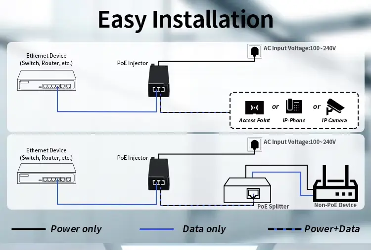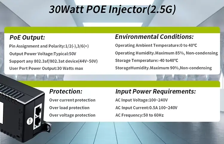 Khả năng tương thích nguồn: Tương thích với các thiết bị IEEE802.3af (15.4W), IEEE802.3at (30W) và thậm chí cả các thiết bị IEEE802.3bt (90W) / PoE++ (60W).