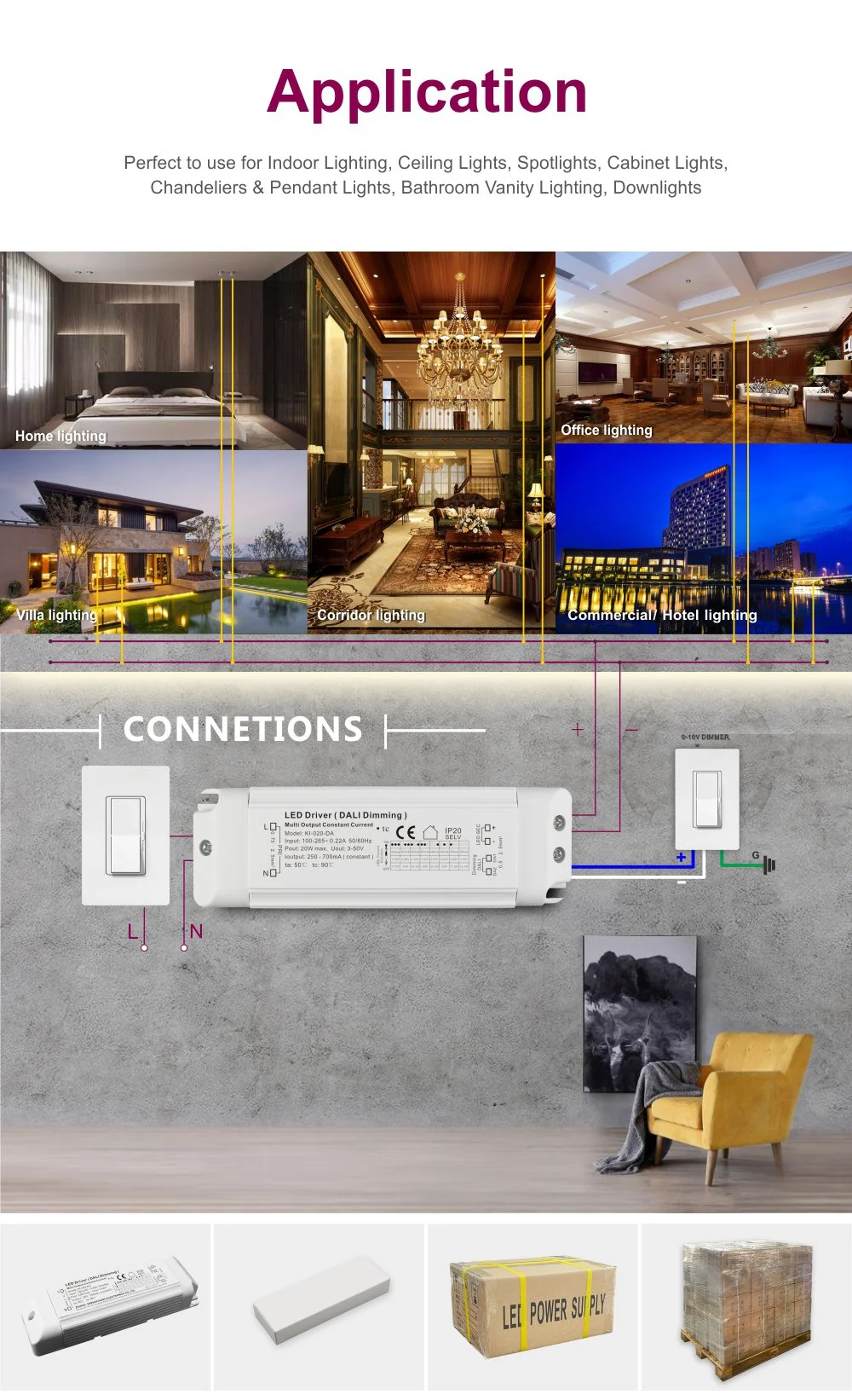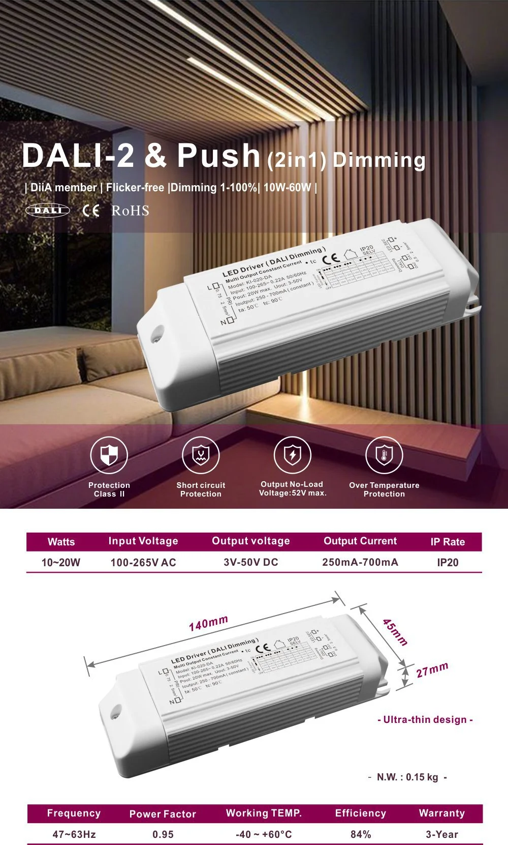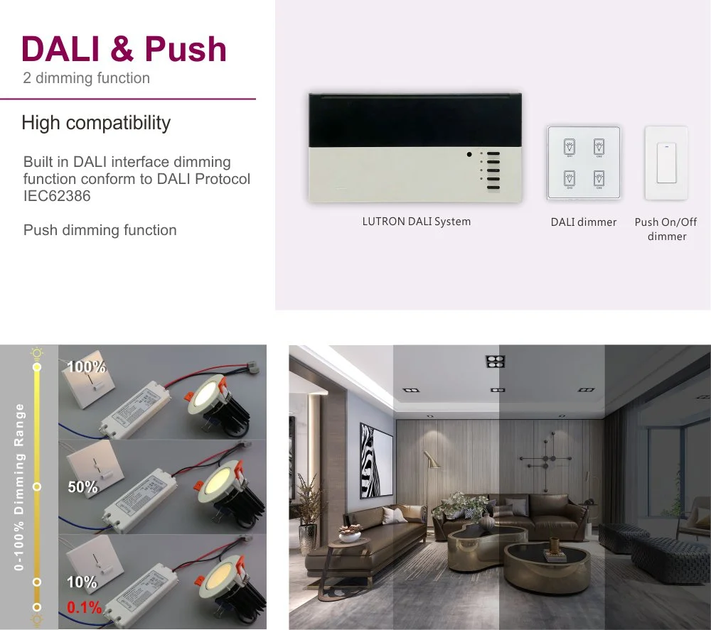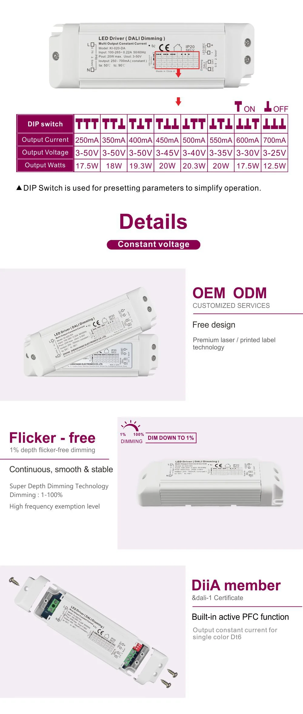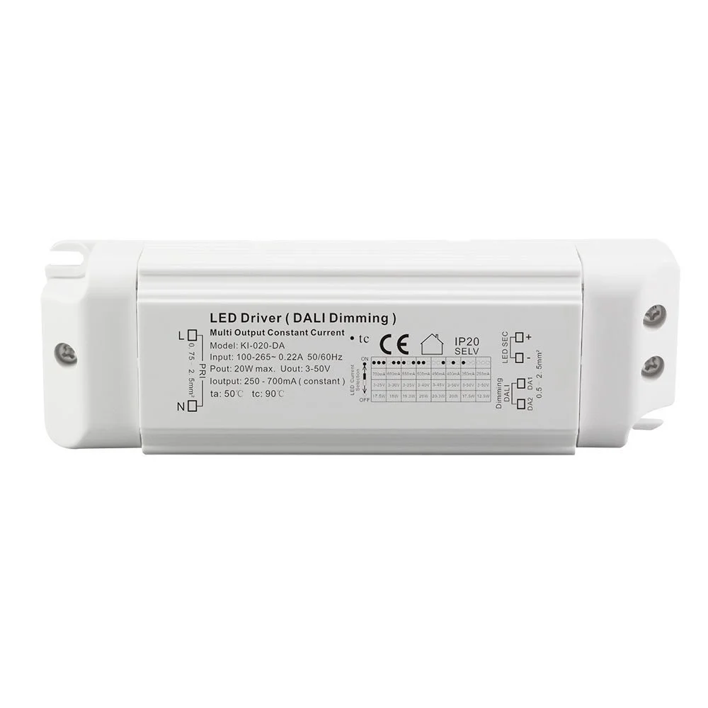 Là nguồn cung cấp dòng điện không đổi điều chỉnh độ sáng Dali 20W đáng tin cậy cho đèn LED, nó đảm bảo cung cấp dòng điện không đổi thuần khiết và không nhấp nháy cho các mô-đun hoặc dải đèn LED. Vỏ sản phẩm sử dụng Vỏ nhựa dòng điện không đổi AC-DC điều khiển đèn LED 20W có thể điều chỉnh độ sáng để chiếu sáng đèn LED, có cấu trúc nhỏ gọn và chắc chắn với hiệu suất tản nhiệt tuyệt vời, đồng thời hỗ trợ cả lắp đặt tích hợp và bên ngoài.