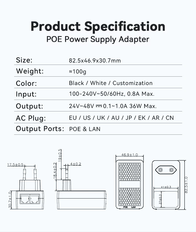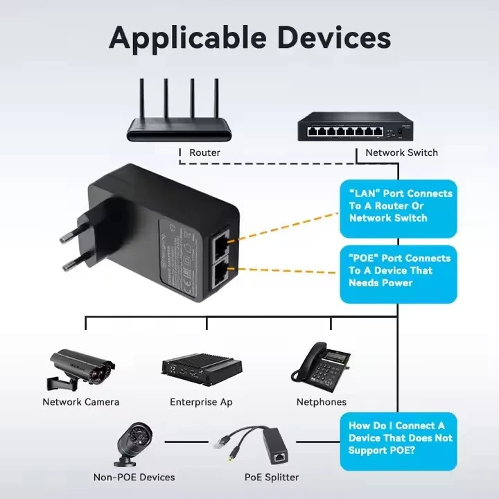 Đầu phun POE cắm tường EU 24V 1A của nhà máy STARWELL có đầu vào AC phổ dụng (100-240V) với các đầu ra có thể lựa chọn: 24V/0,5A, 24V/1A hoặc 48V/0,5A. Nó hỗ trợ cả giao thức PoE thụ động và chủ động, với khả năng gán chân linh hoạt bao gồm Midspan (4,5+/7,8-) và Endspan (1,2+/3,6-). Hoàn toàn tuân thủ các tiêu chuẩn PoE++ của IEEE802.3af/at/bt, nó mang lại khả năng tốc độ dữ liệu vượt trội, từ 10/100/1000M đến 2,5G/5G/10G bps.