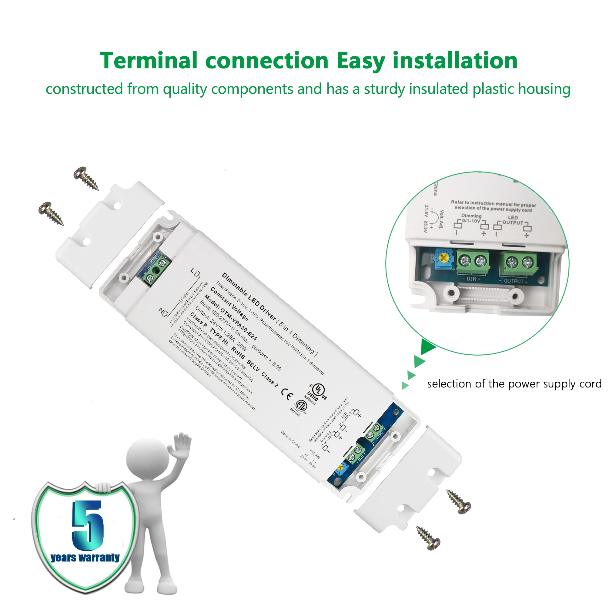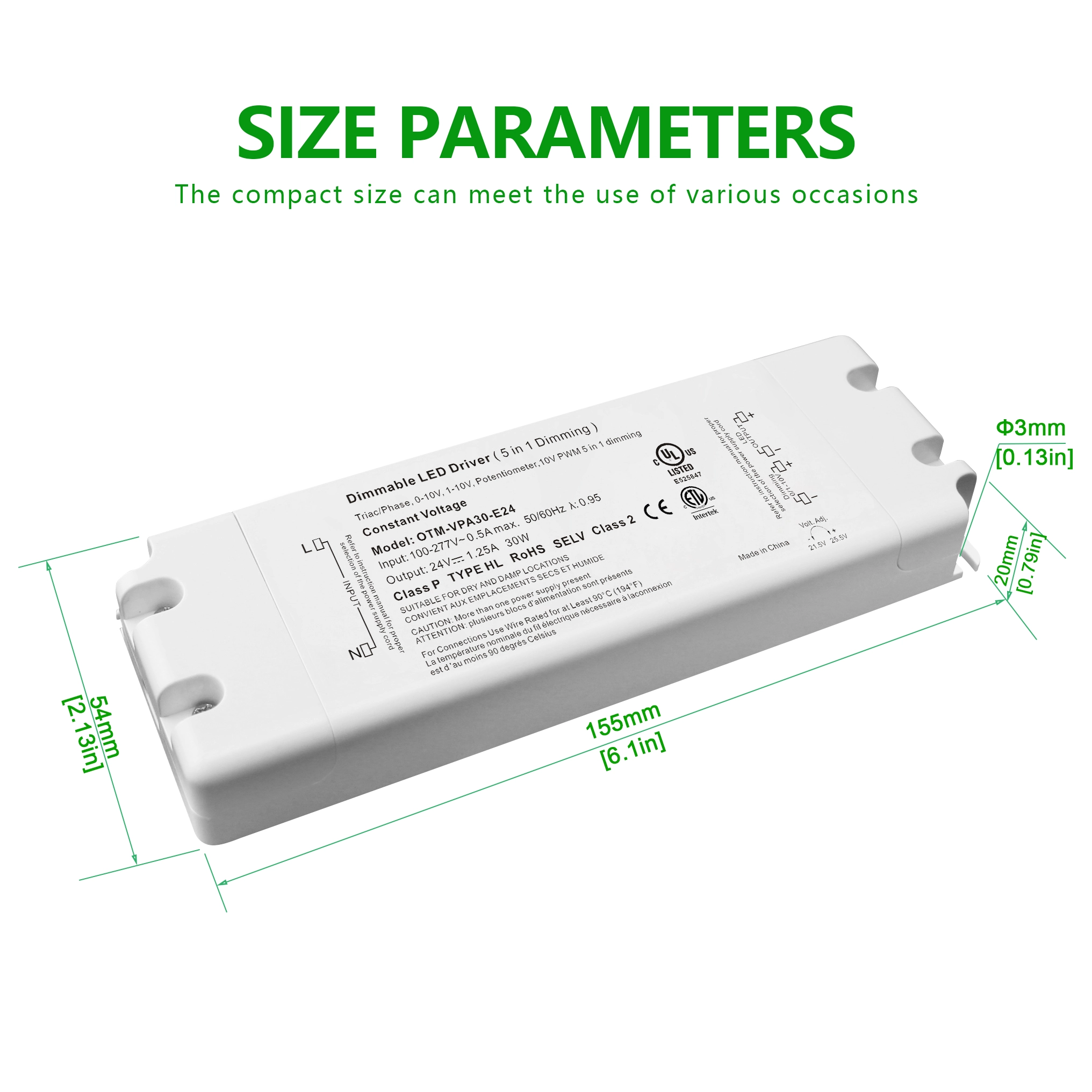 2. Đầu ra có điện áp không đổi ổn định: Bộ điều khiển đèn LED có điện áp không đổi 0-10V cung cấp điện áp đầu ra cố định 24V với tốc độ điều chỉnh điện áp là ± 2% và độ gợn sóng ≤ 120mVp-p, đảm bảo hiệu suất đèn LED ổn định.
