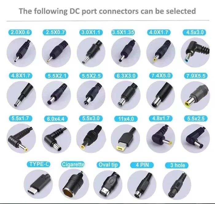 3. Khả năng tương thích của đầu nối: Xác nhận rằng phích cắm đầu ra DC của bộ chuyển đổi có cực chính xác (thường là cực dương ở giữa) và kích thước vật lý (ví dụ: 5,5 mm x 2,1 mm) để vừa khít với giắc cắm nguồn của thiết bị của bạn một cách an toàn.