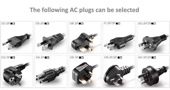 12V12A, 12V13A, 12V13.5A, 12.6V12A, 12.6V12.8A, 15V10A, 15V10.5A, 16.8V9.5A, 16.8V9.64, 18V10A, 19V9A, 19V9.47A, 20V9A, 20V8.5A, 21V8.5A, 21V8.57A, 24V7A, 24V7.5A, 25V7A, 25V7.2A, 25.2V7A, 25.2V7.14A, 29.4V6A, 29.4V6.12A, 30V6A, 33.6V5.35A, 33.6V5A, 42V4A, 42V4.28A |