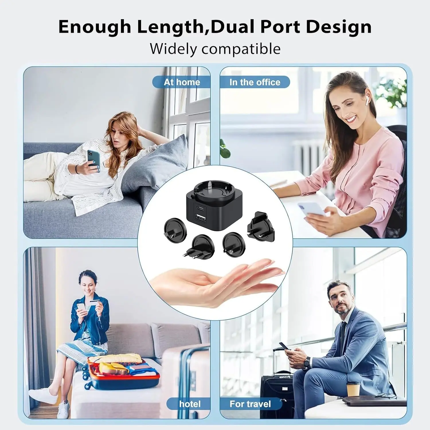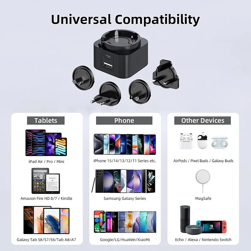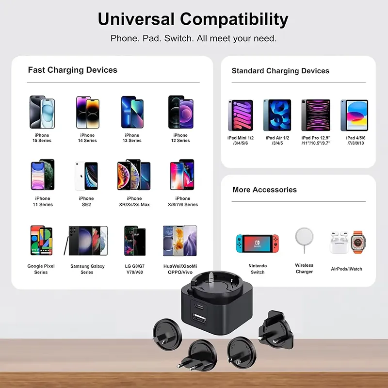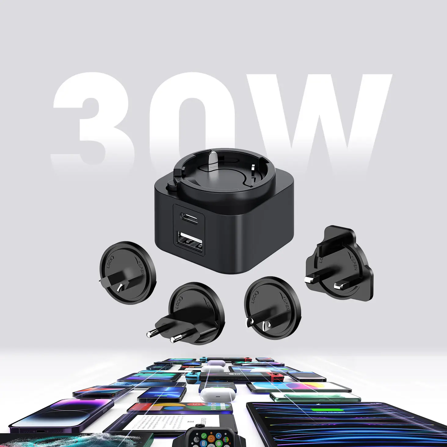 Tính linh hoạt là chìa khóa. Thiết kế cổng kép (USB-C/USB-A) cho phép bạn sạc cùng lúc hai thiết bị. Bộ sạc PD phích cắm có thể hoán đổi 30W có một bộ phích cắm có thể hoán đổi cho nhau (US/EU/UK/AU), khiến nó trở thành người bạn đồng hành hoàn hảo của bạn khi đi du lịch khắp thế giới. Cho dù bạn đang sạc điện thoại thông minh, máy tính bảng hay máy tính xách tay, khả năng tương thích phổ quát sẽ đảm bảo hiệu suất cao nhất.