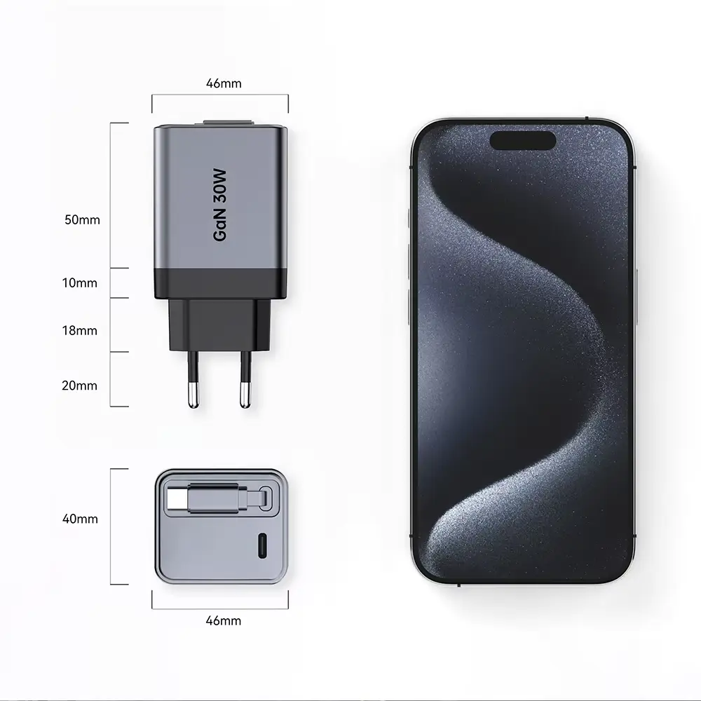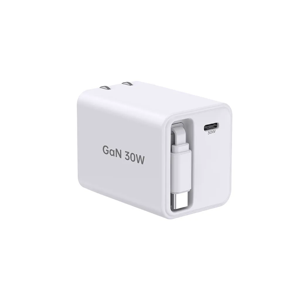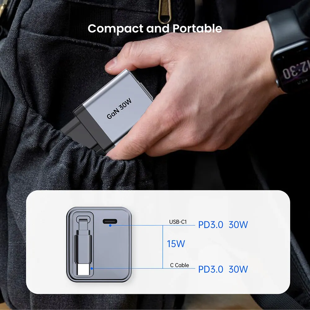 Bộ sạc nhanh 30W với cáp Type C có thể thu vào Thiết kế siêu nhẹ, bỏ túi giúp bạn dễ dàng mang theo bên mình. Đó là sự lựa chọn hoàn hảo cho gia đình, văn phòng hoặc du lịch.