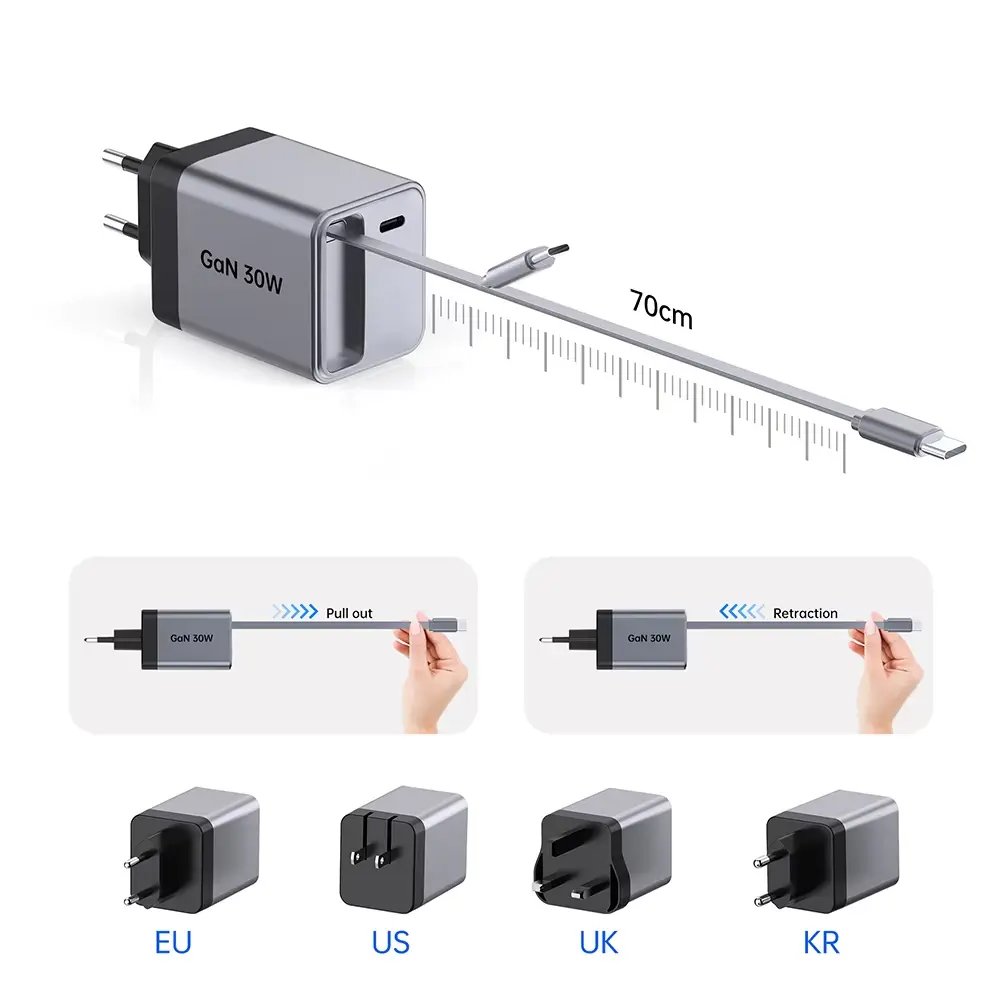 Bộ sạc nhanh 30W với cáp loại C có thể thu vào Tính năng: