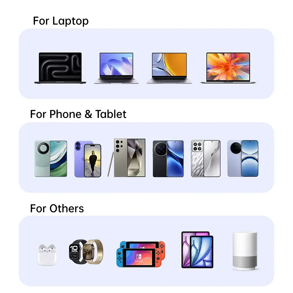 Tương thích với các thiết bị USB-C, bao gồm điện thoại di động, tai nghe và phụ kiện chơi game. Tự động phát hiện nhu cầu của thiết bị để sạc an toàn và hiệu quả. 4. Tính di động sẵn sàng cho du lịch