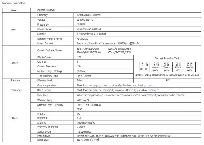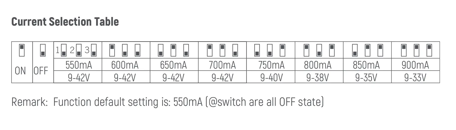 Dòng điện đầu ra: có thể điều chỉnh, xem bảng lựa chọn dòng điện để biết chi tiết