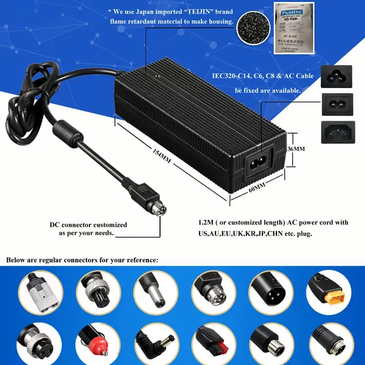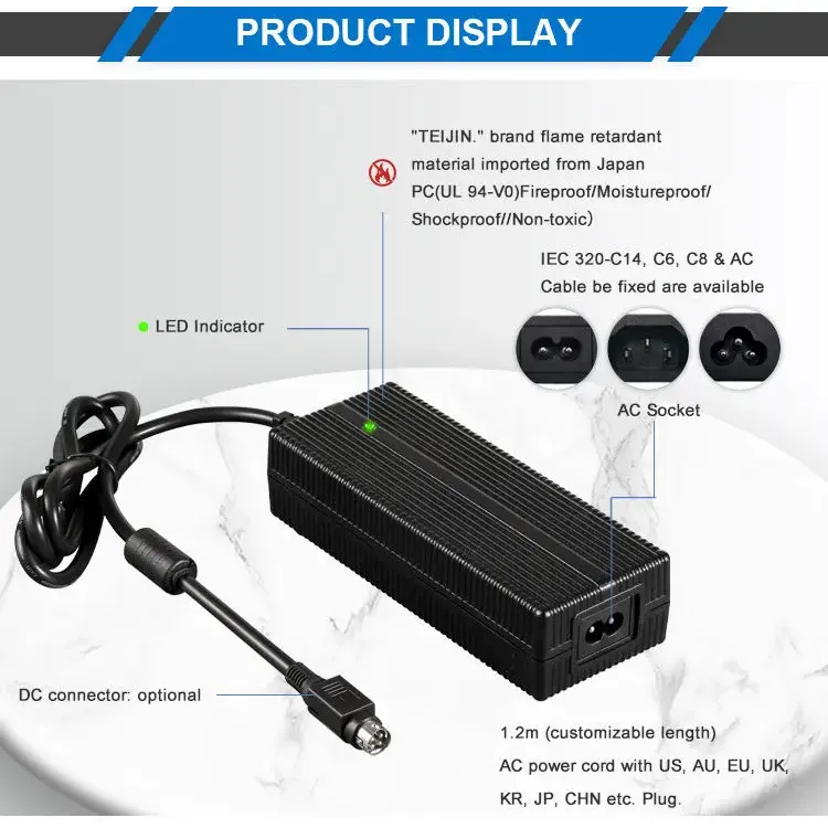 Khả năng tương thích toàn cầu và thiết kế linh hoạt: Được thiết kế với phạm vi đầu vào AC phổ biến là 100–240VAC, 50/60Hz, bộ sạc này hỗ trợ sử dụng trên toàn thế giới. Nó có nhiều tùy chọn đầu vào AC (IEC320-C14, C6, C8) và đi kèm với dây nguồn 1,2M có thể tùy chỉnh với các phích cắm của Hoa Kỳ, Úc, EU, Vương quốc Anh, KR, JP, CHN và các phích cắm khu vực khác. Vỏ được làm từ vật liệu chống cháy PC, đảm bảo độ bền và an toàn trong nhiều điều kiện hoạt động khác nhau.