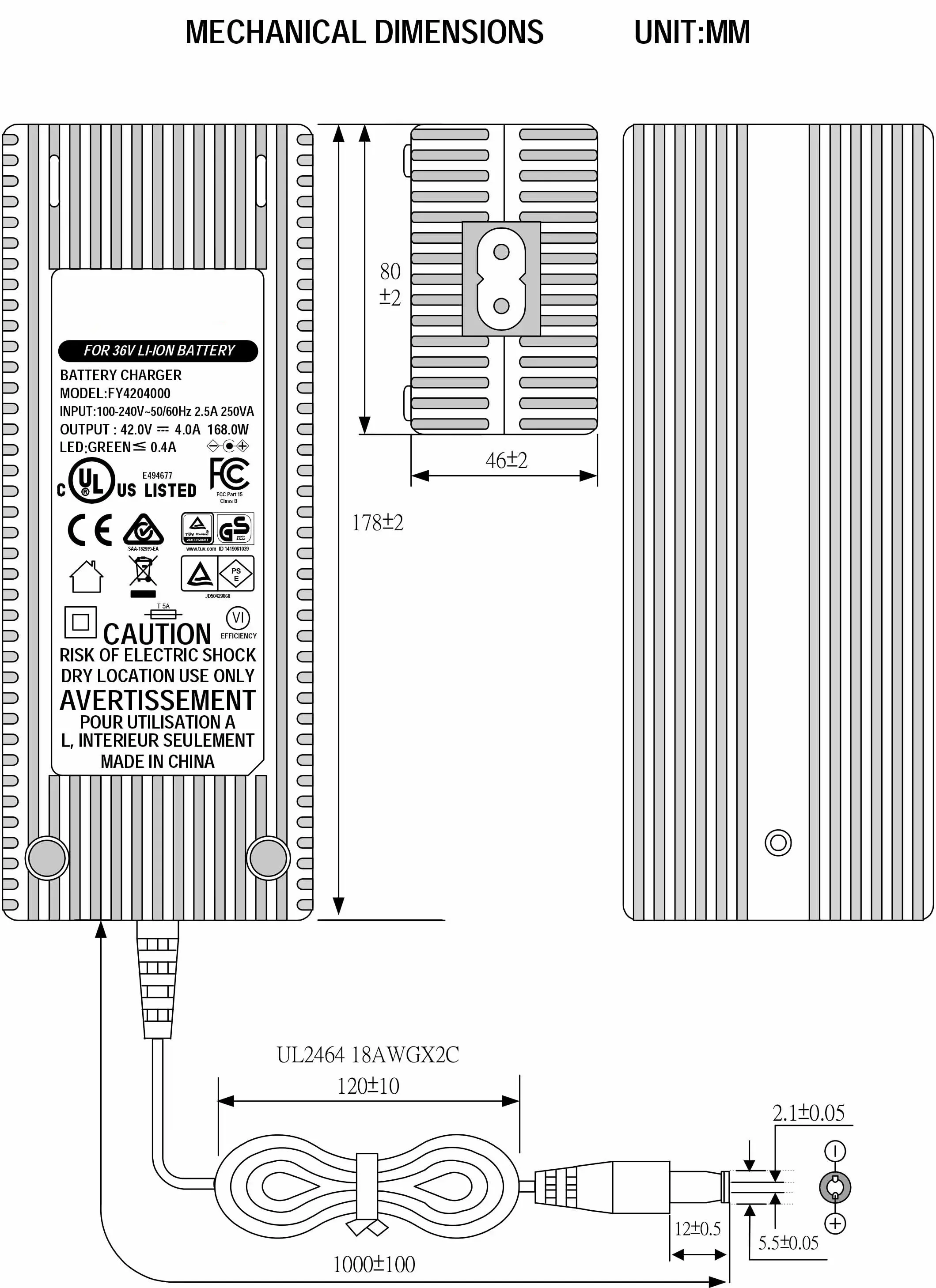 Bảo vệ và chứng nhận toàn diện: An toàn là trên hết. Bộ sạc pin xe tay ga 42V 4A có cơ chế bảo vệ mạnh mẽ bao gồm bảo vệ ngắn mạch, quá điện áp, quá nhiệt và quá tải, cùng với thử nghiệm HIPOT lên đến 4200V để tăng cường độ an toàn cách điện. Nó hoạt động hiệu quả với hiệu suất >89% và có danh sách đầy đủ các chứng nhận toàn cầu: UL, CUL, GS, CE, BS, SAA, KC, PSE, CB, FCC, EMC, ROHS và REACH, tuân thủ các tiêu chuẩn an toàn như UL60950, IEC60950 và IEC60335.