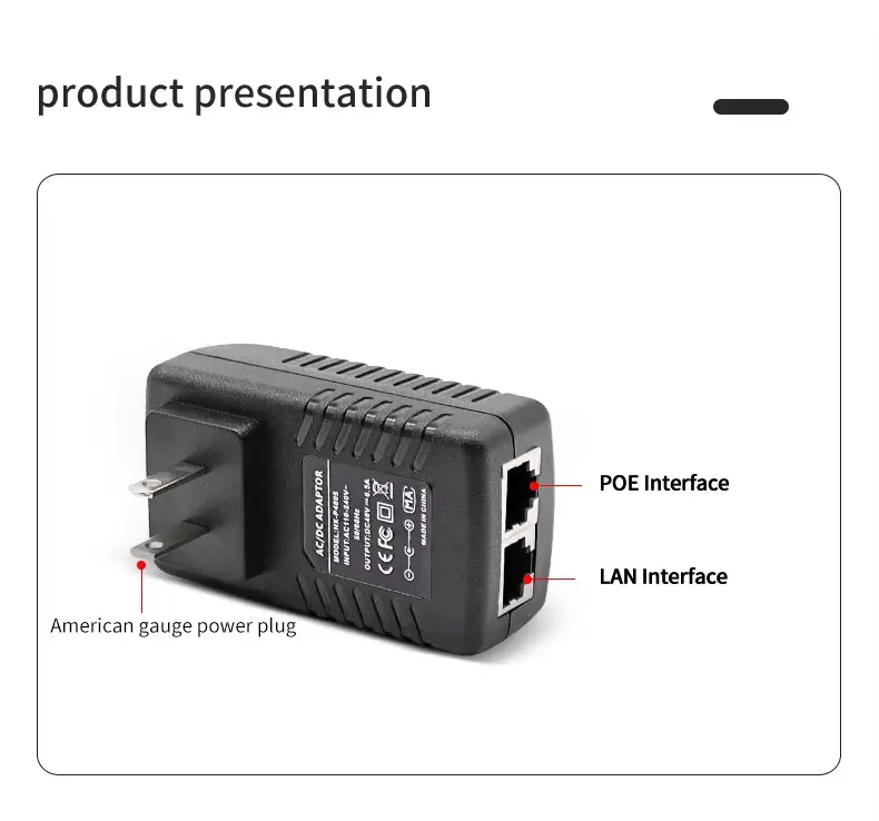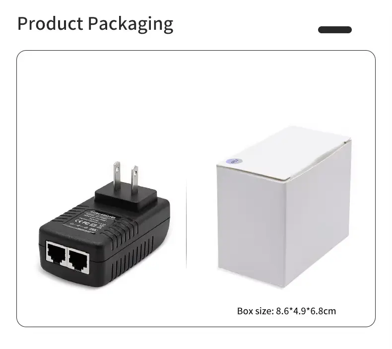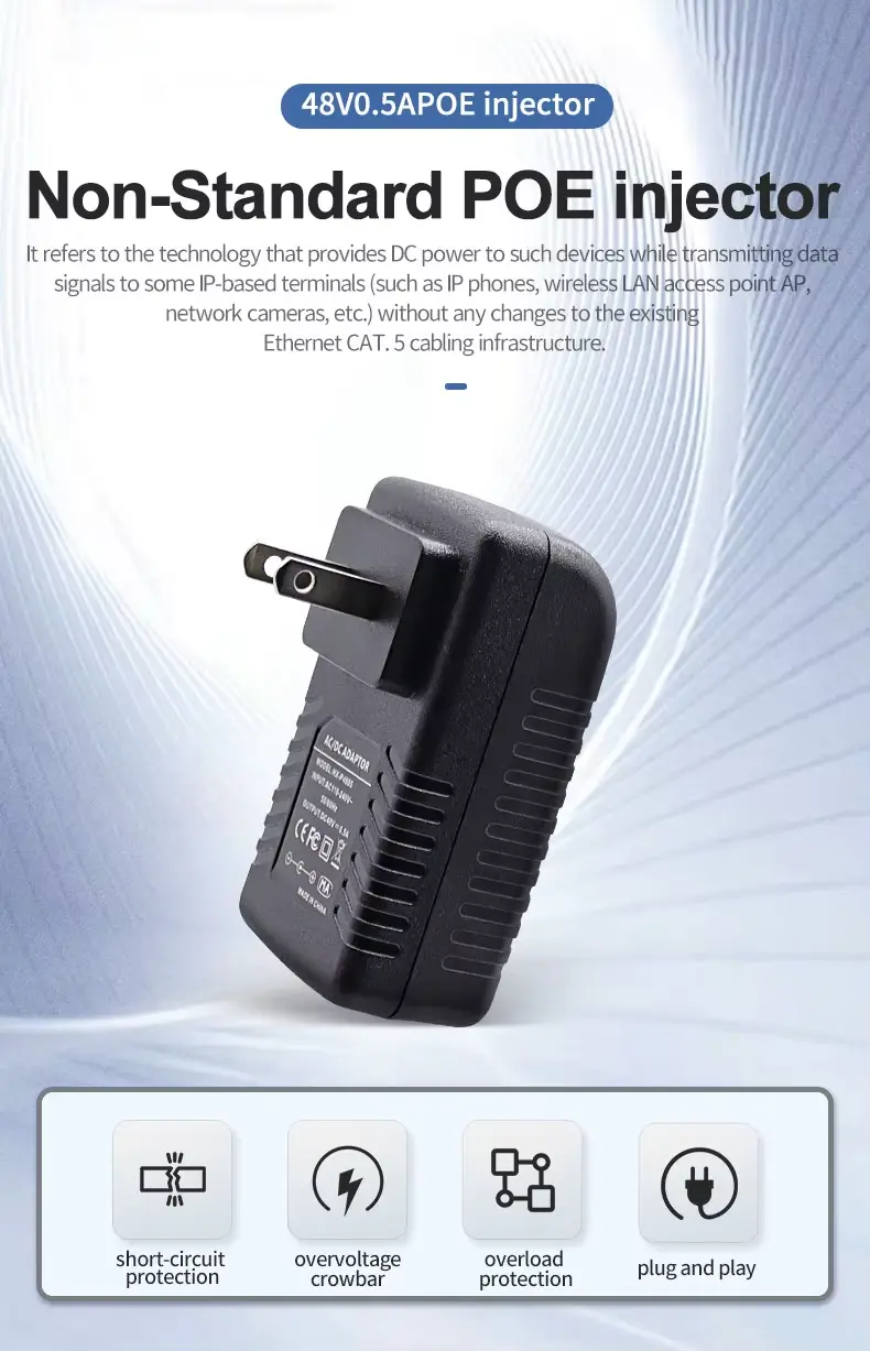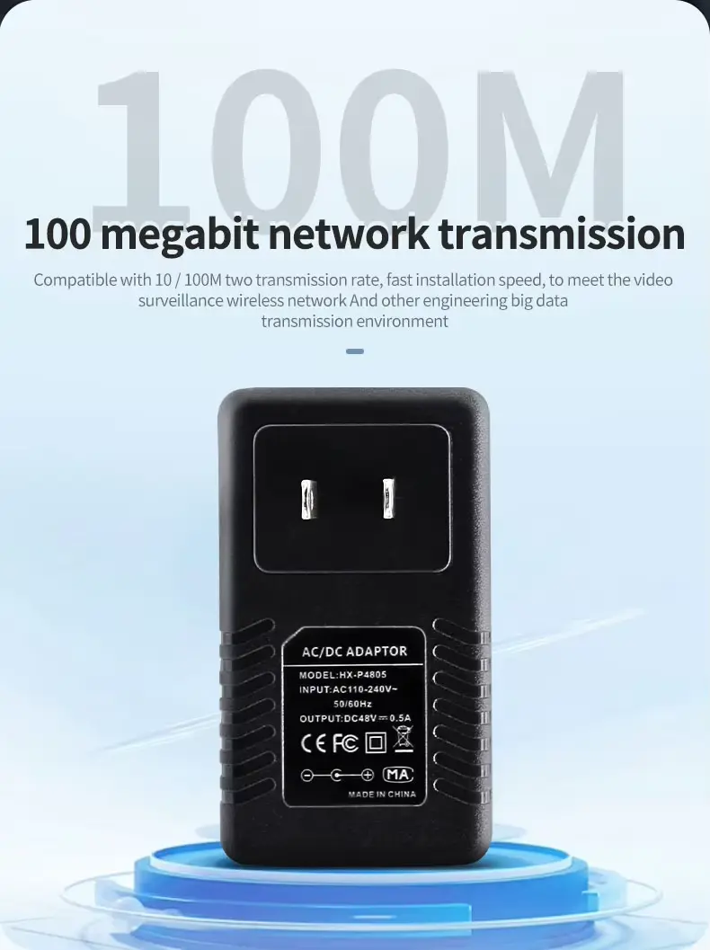 Bộ chuyển đổi Ethernet PoE Injector cắm tường 48V 0,5A chất lượng cao được cung cấp bởi nhà sản xuất Trung Quốc Starwell. Bộ cấp nguồn này cung cấp công suất đầu ra 24W (48V/0,5A), khiến nó đặc biệt phù hợp với các thiết bị không dây ngoài trời—chẳng hạn như các thiết bị của các thương hiệu như Ubiquiti và MikroTik—cũng như camera IP tầm xa và cầu nối mạng. Sản phẩm có nhiều cơ chế bảo vệ chống quá áp, quá dòng và ngắn mạch; nó hoạt động trong phạm vi nhiệt độ từ -10°C đến 60°C và được bảo hành 5 năm.