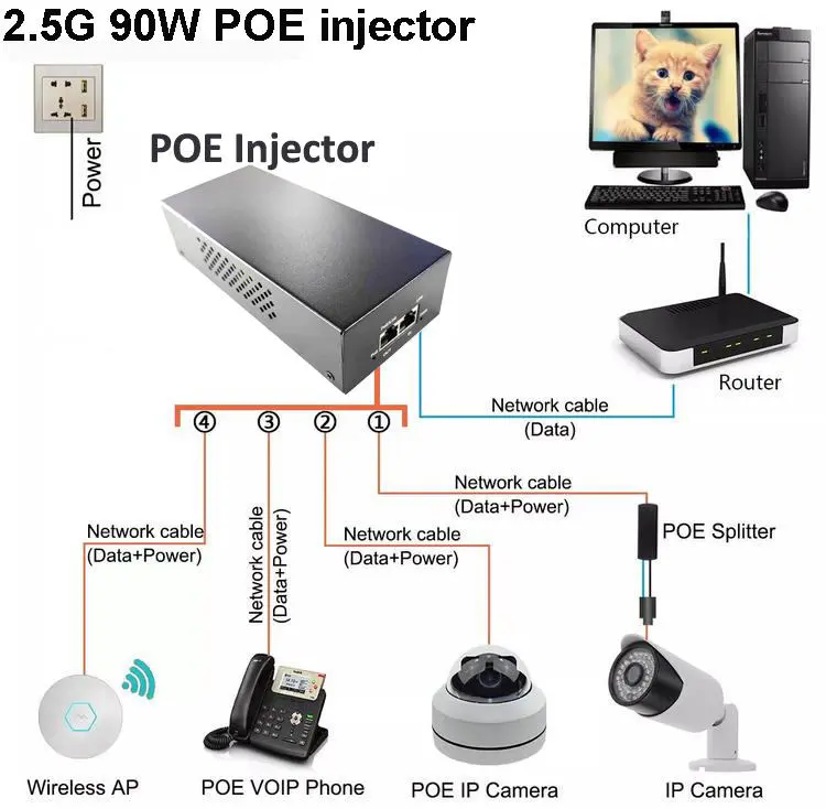 Bộ chuyển đổi PoE Injector PoE 48V 90W của nhà máy Starwell, một giải pháp hiệu suất cao được thiết kế để cấp nguồn và phân phối dữ liệu đáng tin cậy qua Ethernet. Hoàn toàn tuân thủ các tiêu chuẩn PoE++ của IEEE802.3af/at/bt, bộ tiêm này đảm bảo truyền dữ liệu tốc độ cao 2,5G ổn định và có thể cấp nguồn cho các thiết bị có nhu cầu cao như camera IP, AP không dây, bộ chuyển mạch mạng và thiết bị đầu cuối IP. Thiết kế nhỏ gọn, plug-and-play của nó giúp đơn giản hóa việc cài đặt trong mạng gia đình, văn phòng và công nghiệp, cung cấp nguồn điện PoE an toàn và hiệu quả với thiết lập tối thiểu.
