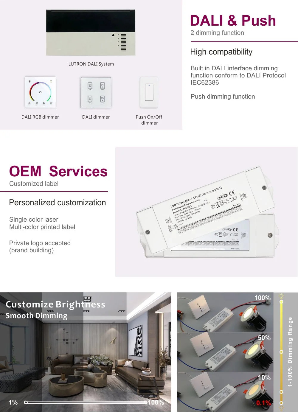 ·Chức năng làm mờ: DALI Dimming: Giao thức DALI IEC62386 chức năng làm mờ PUSH