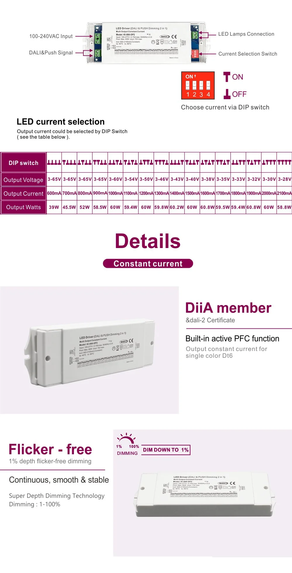 Tính năng Trình điều khiển đèn LED dòng điện đầu ra không đổi cho DT8 một màu