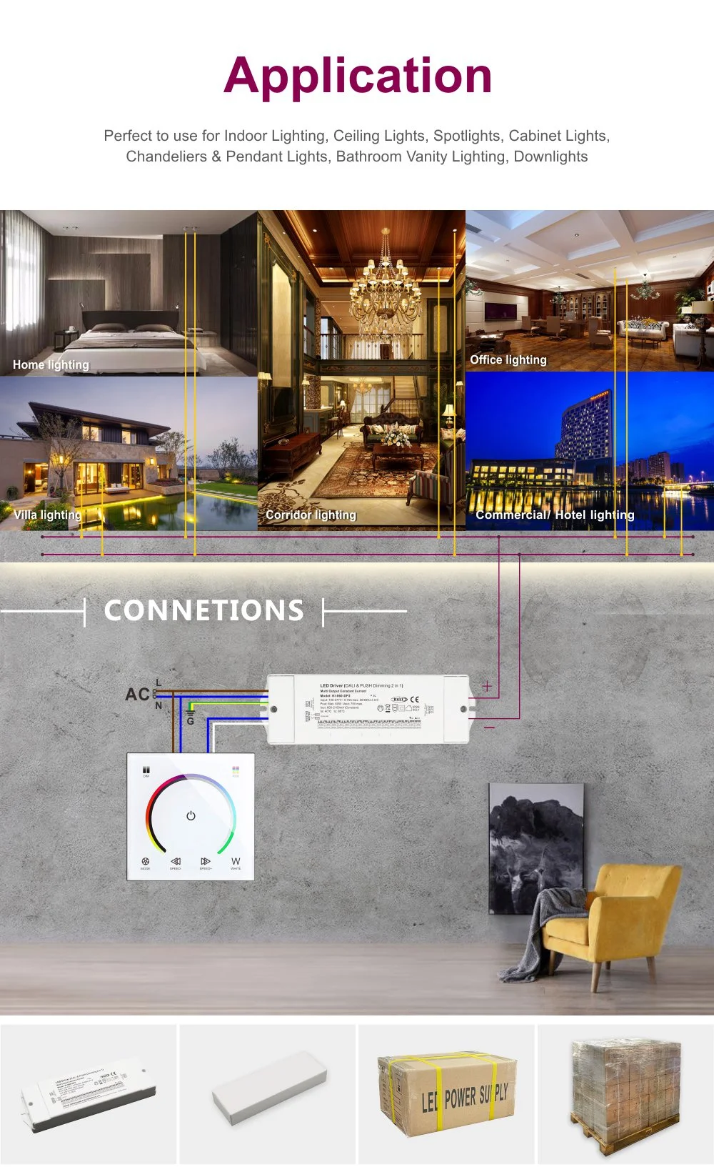 Cho dù đó là đèn LED panel trong văn phòng, đèn LED âm trần trong trung tâm mua sắm, dải đèn ẩn trong hành lang khách sạn hay hệ thống chiếu sáng tạo điểm nhấn trong không gian gia đình, bộ điều khiển này đều là sự lựa chọn lý tưởng. Vỏ hợp kim nhôm nhỏ gọn với toàn bộ bầu đảm bảo quản lý nhiệt tuyệt vời và hoạt động ổn định lâu dài. Tích hợp nhiều mạch bảo vệ quá điện áp, quá dòng, ngắn mạch và quá nhiệt mang lại sự bảo vệ an toàn toàn diện cho toàn bộ hệ thống chiếu sáng.