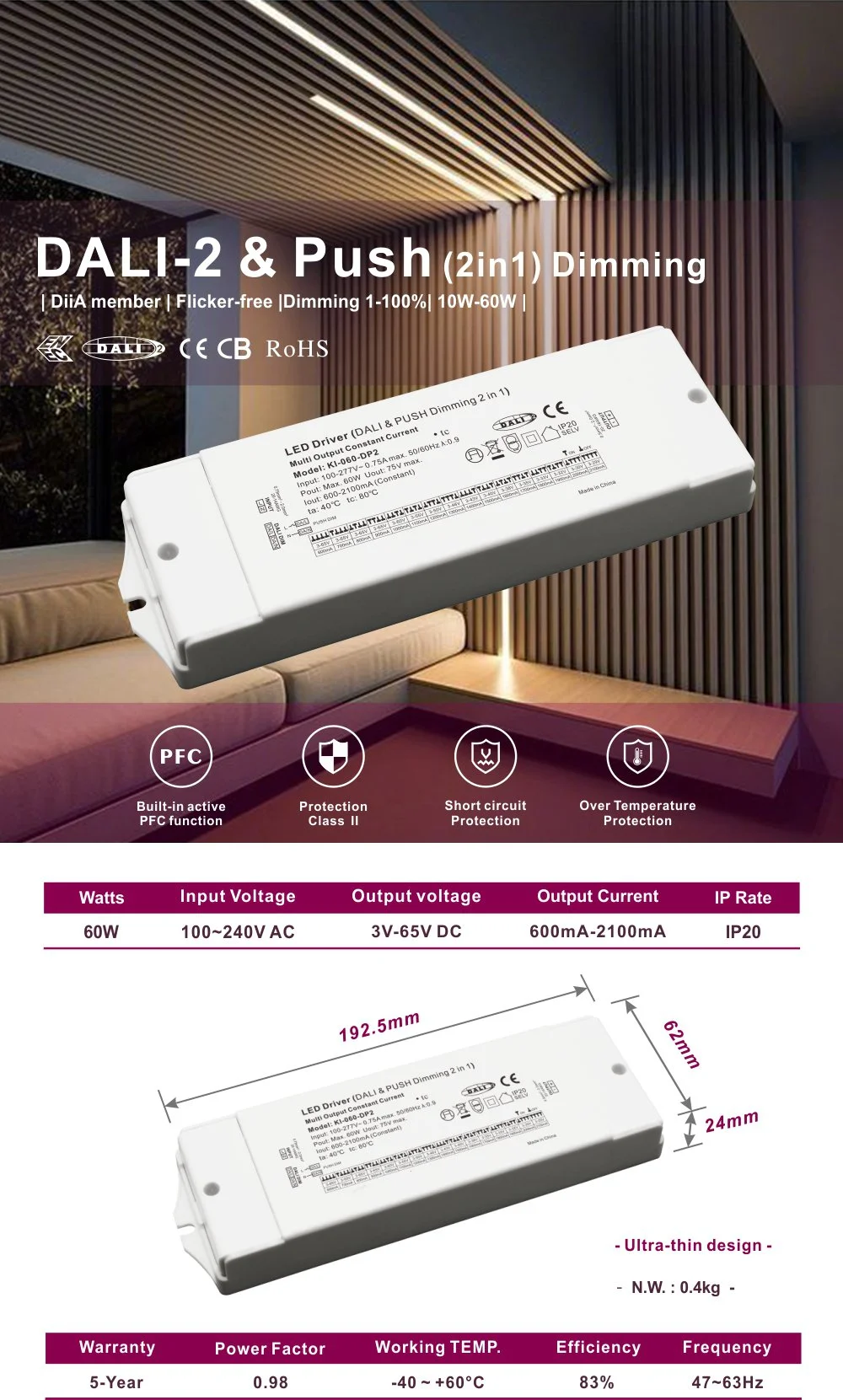 Trình điều khiển đèn LED CCT Dali mờ hiện tại 60W không đổi |