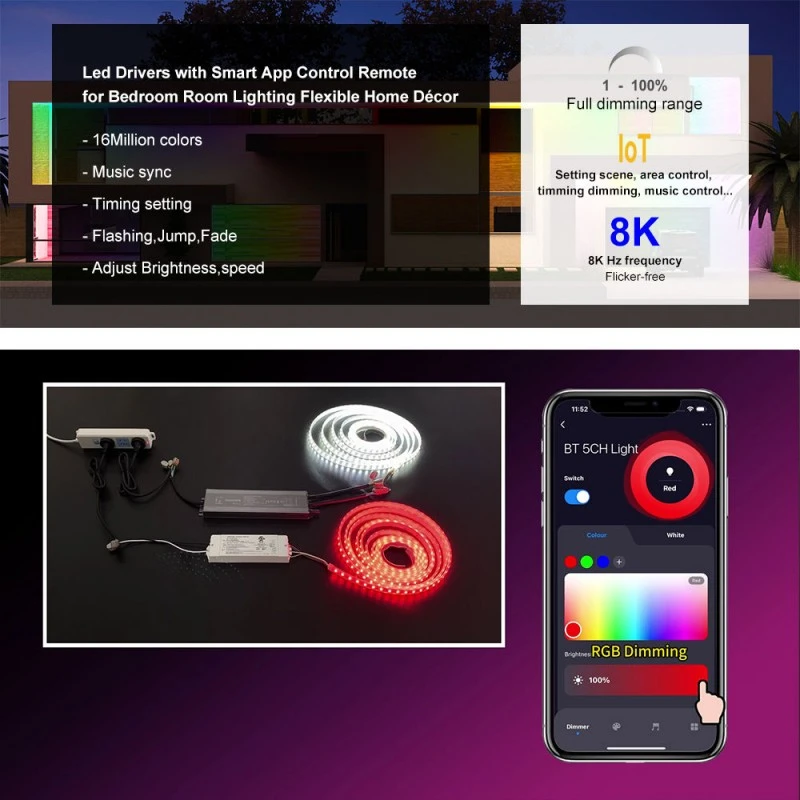 Làm mờ thông minh trong tầm tay bạn Với mô-đun không dây ZigBee tích hợp với công nghệ TUYA, trình điều khiển này cung cấp khả năng điều khiển thông minh liền mạch. Điều chỉnh độ sáng thông qua ứng dụng di động hoặc lệnh thoại thông qua Google Home và Amazon Echo. Đầu ra 8K Hz tần số cao đảm bảo độ mờ hoàn toàn không bị nhấp nháy, trong khi phạm vi độ mờ 1-100% với độ sâu 1% cho phép chuyển tiếp mượt mà và tạo ra bầu không khí hoàn hảo.
