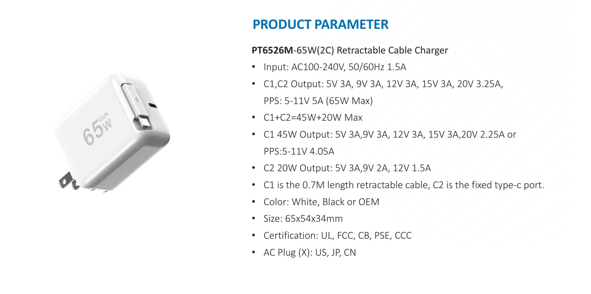 Thông số kỹ thuật của Bộ sạc PD 65W có cáp usb c có thể kéo được: