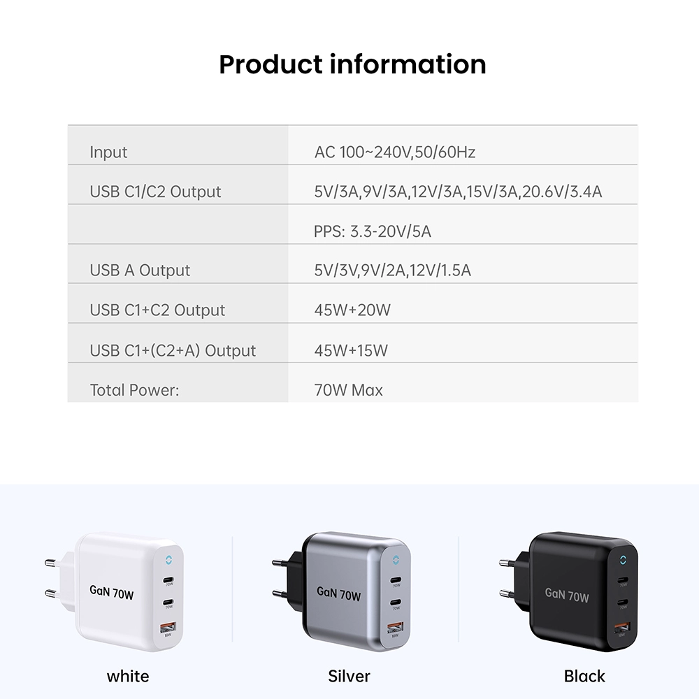 Đầu ra C1/C2: 5V3A,9V3A,12V3A,15V3A,20.6V3.4A (Tối đa 70W) PPS: 3.3-11V 4.05A Đầu ra USB-A: 5V3A,9V2A,12V1.5A 3.3-11V 2A(Tối đa 22W) Công suất C1+C2: 45W+20W Đầu ra C1+C2+USB-A: 45W+5V3A Tổng cộng:70W |