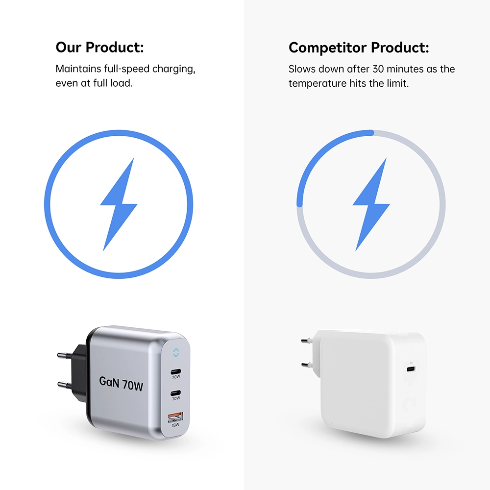Bộ sạc nhanh 70W PD bền bỉ của Starwell dành cho máy tính bảng latpop còn gọi là Bộ sạc nhanh GaN 70W: 2C1A, đáp ứng nhu cầu sạc nhanh hàng ngày cho điện thoại di động và thiết bị máy tính bảng. Kích thước nhỏ, hiệu suất mạnh mẽ, với công nghệ gallium nitride tiên tiến. Khi sử dụng ở một cổng duy nhất, công suất đầu ra tối đa của giao diện USB-C1 là 70W. Khi sử dụng hai cổng cùng nhau, USB-C1 vẫn duy trì sạc nhanh PD 45W. Hỗ trợ nhiều giao thức sạc nhanh, bao gồm PD3.0, PPS, QC4+ và QC3.0, đảm bảo khả năng tương thích rộng rãi với nhiều thiết bị khác nhau