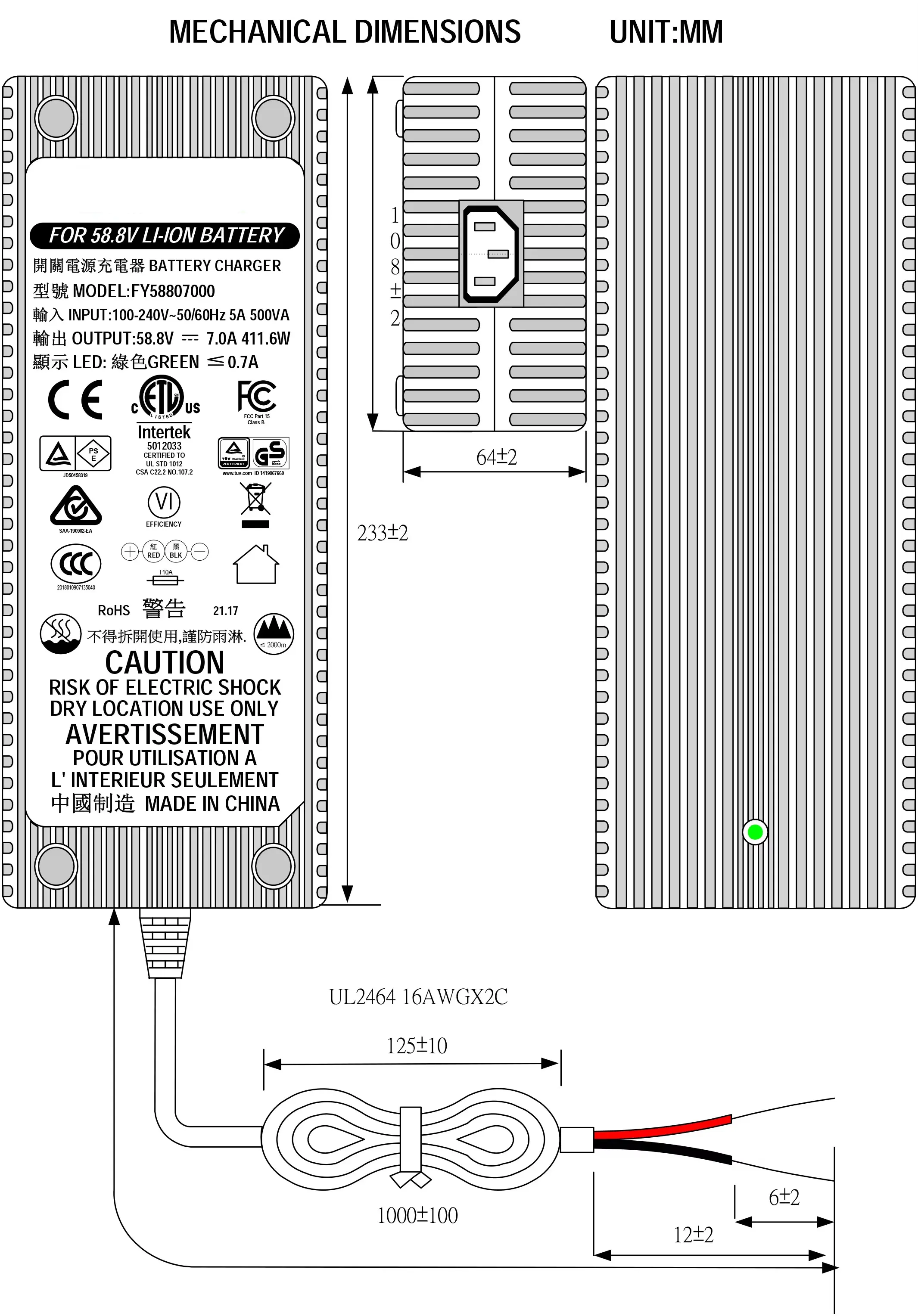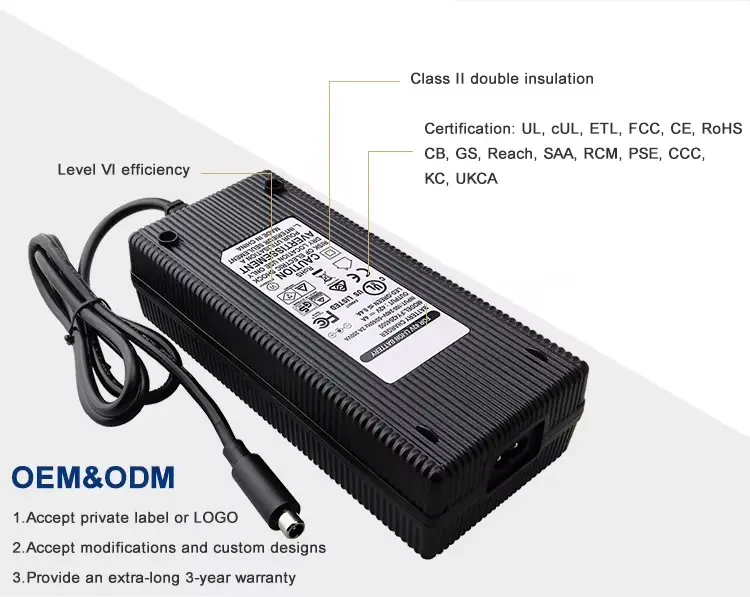 Được chứng nhận theo tiêu chuẩn UL, ETL, CUL, GS, CE, BS, SAA ,KC, PSE, CB, FCC, EMC, RoHS, REACH, bộ sạc này cung cấp năng lượng hiệu quả, nhanh chóng và an toàn cho các ứng dụng di chuyển bằng điện đòi hỏi khắt khe.