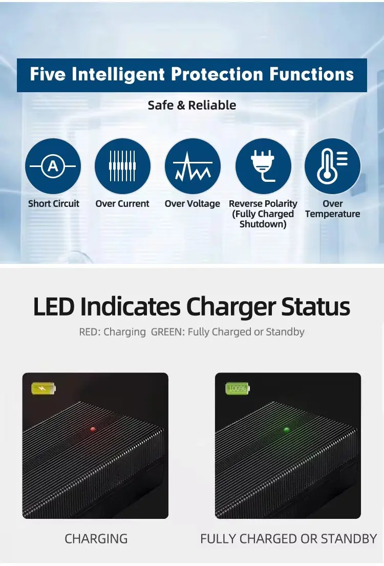 Khả năng tương thích toàn cầu và an toàn mạnh mẽ: Với đầu vào 100–240VAC phổ quát, nó hoạt động trơn tru trên toàn thế giới. Sạc thông minh ba giai đoạn tiên tiến (CC/CV) tối ưu hóa tình trạng pin đồng thời bảo vệ toàn diện—bao gồm đoản mạch, quá điện áp, quá nhiệt và quá tải—đảm bảo vận hành an toàn, không cần lo lắng. Vỏ bền được chế tạo bằng vật liệu chống cháy để nâng cao độ tin cậy trong môi trường đòi hỏi khắt khe.