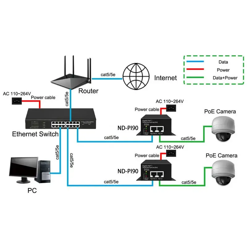 Truyền dữ liệu tốc độ cao Được trang bị một cổng Gigabit PoE và một cổng đường lên Gigabit RJ45, bộ phun POE 48V hoạt động này hỗ trợ truyền dữ liệu 1000Mbps qua cáp Cat5e, Cat6 hoặc cáp cao hơn. Nó sử dụng tất cả bốn cặp xoắn (1/2,3/6,4/5,7/8) để cấp nguồn và dữ liệu đồng thời, đảm bảo kết nối liền mạch và tính toàn vẹn tín hiệu cho các ứng dụng sử dụng nhiều băng thông.