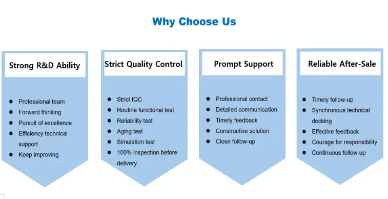 Sản phẩm của chúng tôi tuân thủ nghiêm ngặt các tiêu chuẩn quốc tế và tiêu chuẩn ngành cao từ thiết kế, kiểm tra chất lượng đến sản xuất hàng loạt, đồng thời tuân thủ các tiêu chuẩn quốc tế như CE, FCC, RoHS,ETL, v.v. để đảm bảo khả năng tương thích và tuân thủ trên thị trường toàn cầu.