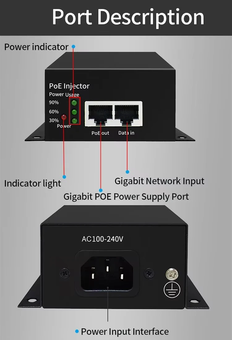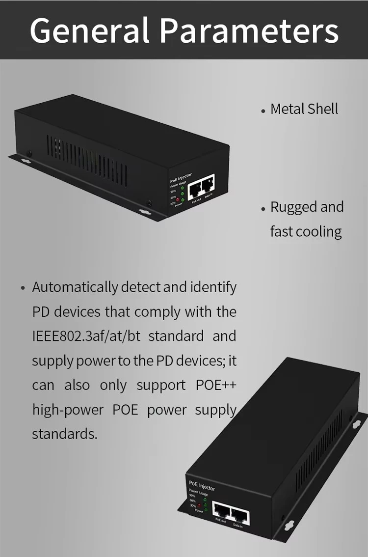 Đầu phun POE hoạt động 60W chất lượng cao được cung cấp bởi nhà sản xuất Starwell Trung Quốc. Nó có một cổng đầu vào dữ liệu 10/100/1000Mbps và một cổng đầu ra PoE (Data+Power). Nó hỗ trợ đầy đủ các yêu cầu phân cực thay thế của 802.3bt, sử dụng cả bốn cặp (1/2+,3/6- & 4/5+,7/8-) để truyền dữ liệu đồng thời và nguồn điện 48V DC.