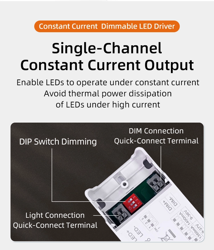 Chế độ làm mờ kép: Trình điều khiển đèn LED làm mờ dòng điện không đổi hỗ trợ đầu vào tín hiệu làm mờ kép 0-10V/1-10V. Phạm vi mờ là 0-100%, với độ tuyến tính mờ ≥95%. Nó có thể đạt được sự chuyển đổi liền mạch và mượt mà từ độ sáng mờ sang độ sáng tối đa mà không có bất kỳ hiện tượng giật hoặc lag nào. Nó tương thích với nhiều hệ thống điều chỉnh độ sáng thông minh khác nhau và có thể đáp ứng các yêu cầu về ánh sáng trong các tình huống khác nhau.