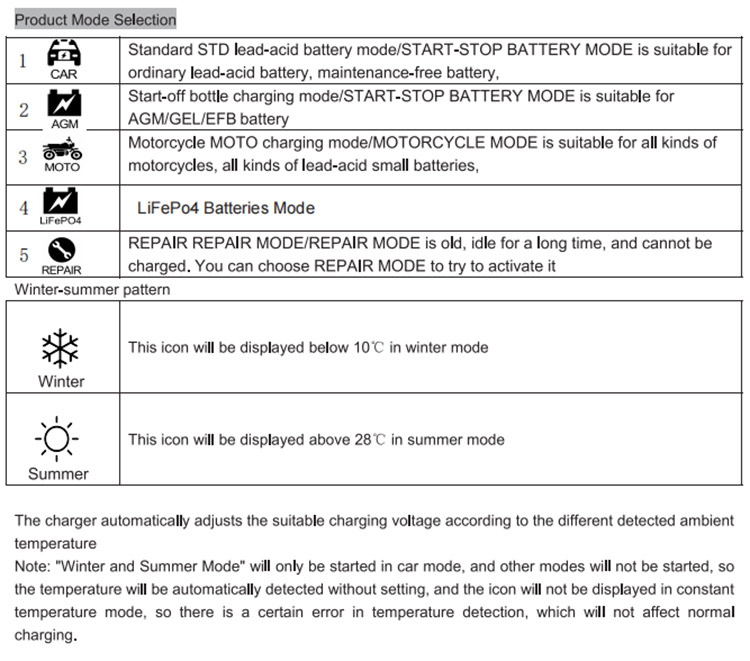 Hỗ trợ loại pin rộng: Tương thích với nhiều loại pin hóa học khác nhau, bao gồm pin ngập nước tiêu chuẩn (ướt), AGM (thảm thủy tinh thấm), gel và canxi, đảm bảo sạc tối ưu cho từng loại cụ thể.